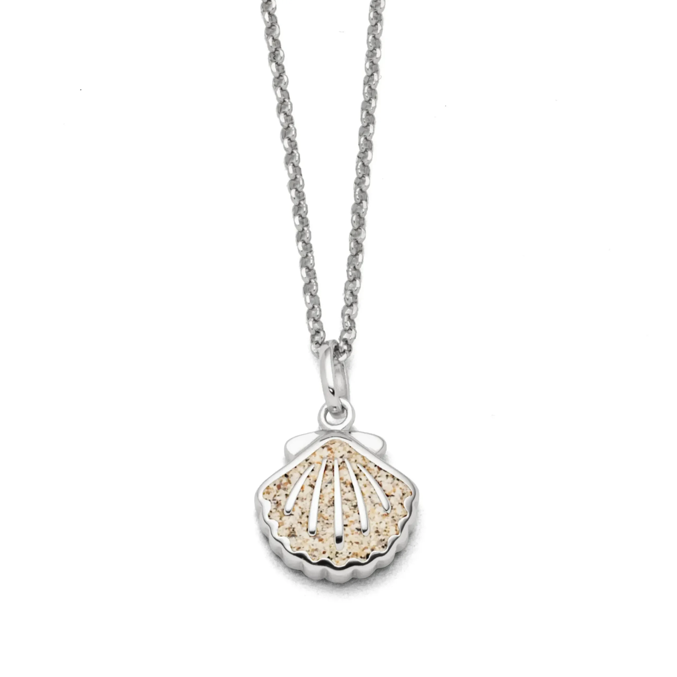 Echte Sehnsucht: Feine Erbskette rhodiniert mit einem Anhänger in Form einer Muschel, gefüllt mit Strandsand, alles aus poliertem und rhodiniertem 925er Sterling-Silber, ca. 45 cm lang. Durch die Rhodinierung ist das Schmuckstück anlaufgeschützt.