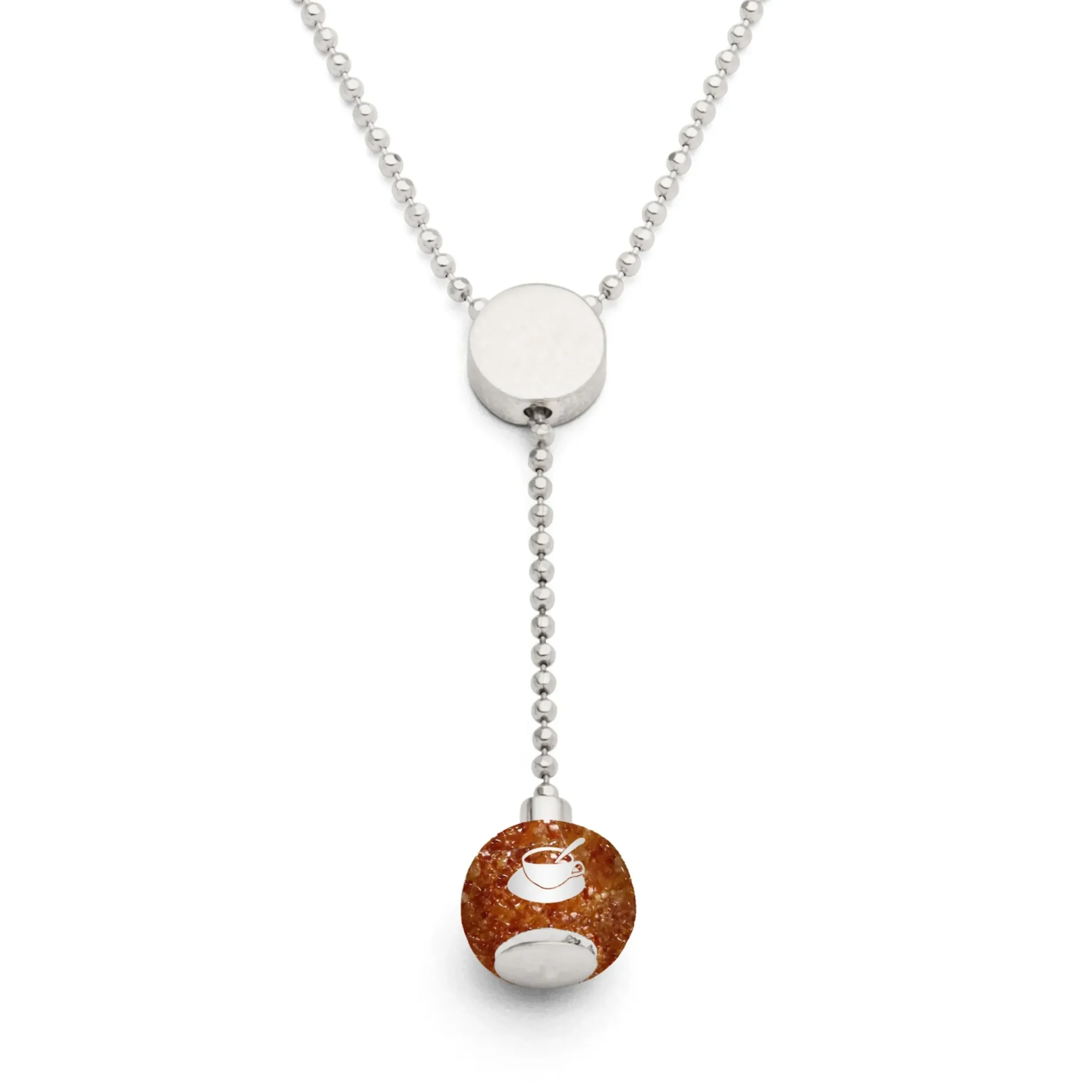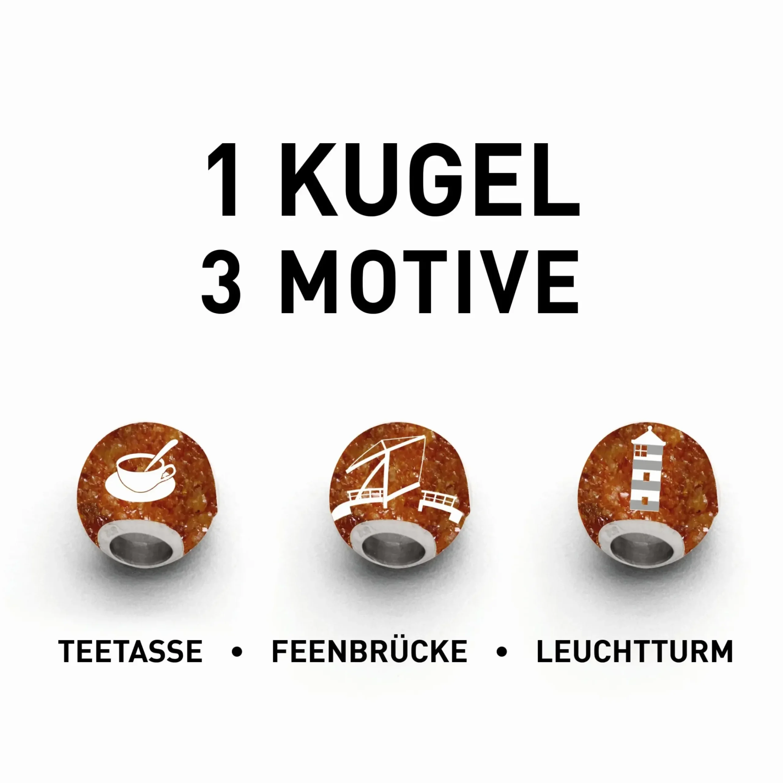 Kette „Ostfriesland“ Bernsteinsand, kombiniert aus einer ca. 42 cm langen, rhodinierten Adapterkette und einem mit Bernsteinsand gefüllten „Ostfriesland“ Bead, gefasst in rhodiniertem, 925er Sterling-Silber. Der Bead ist austauschbar.
