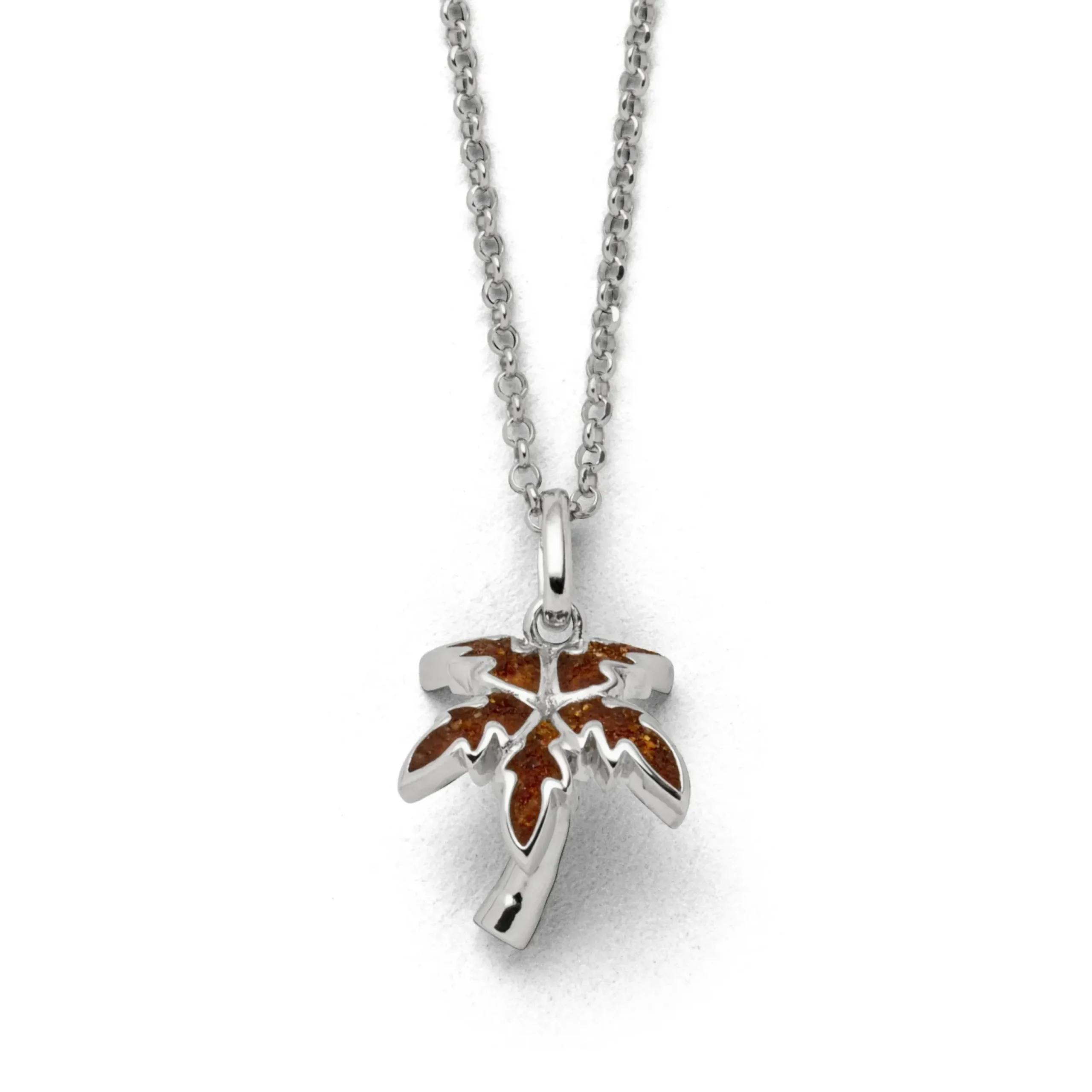 Echte Sehnsucht: Feine Erbskette rhodiniert mit einem Anhänger in Form einer Palme, die Blätter zum Teil gefüllt mit Bernsteinsand, alles aus poliertem und rhodiniertem 925er Sterling-Silber, ca. 42 cm lang. Durch die Rhodinierung ist das Schmuckstück anlaufgeschützt.