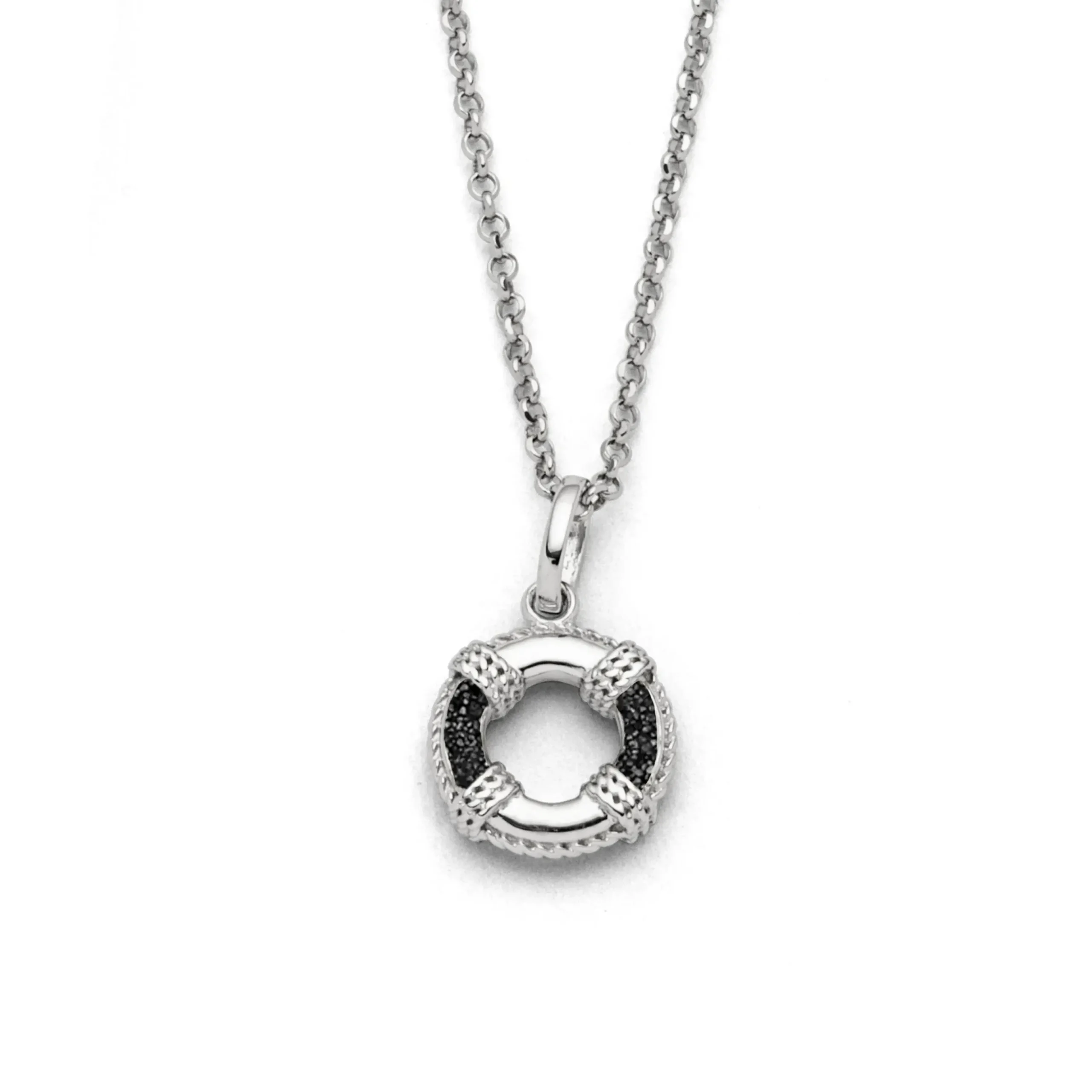 Echte Sehnsucht: Feine Erbskette rhodiniert mit einem Anhänger in Form eines Rettungsringes, teilweise gefüllt mit Lavasand, alles aus poliertem und rhodiniertem 925er Sterling-Silber, ca. 42 cm lang. Durch die Rhodinierung ist das Schmuckstück anlaufgeschützt.