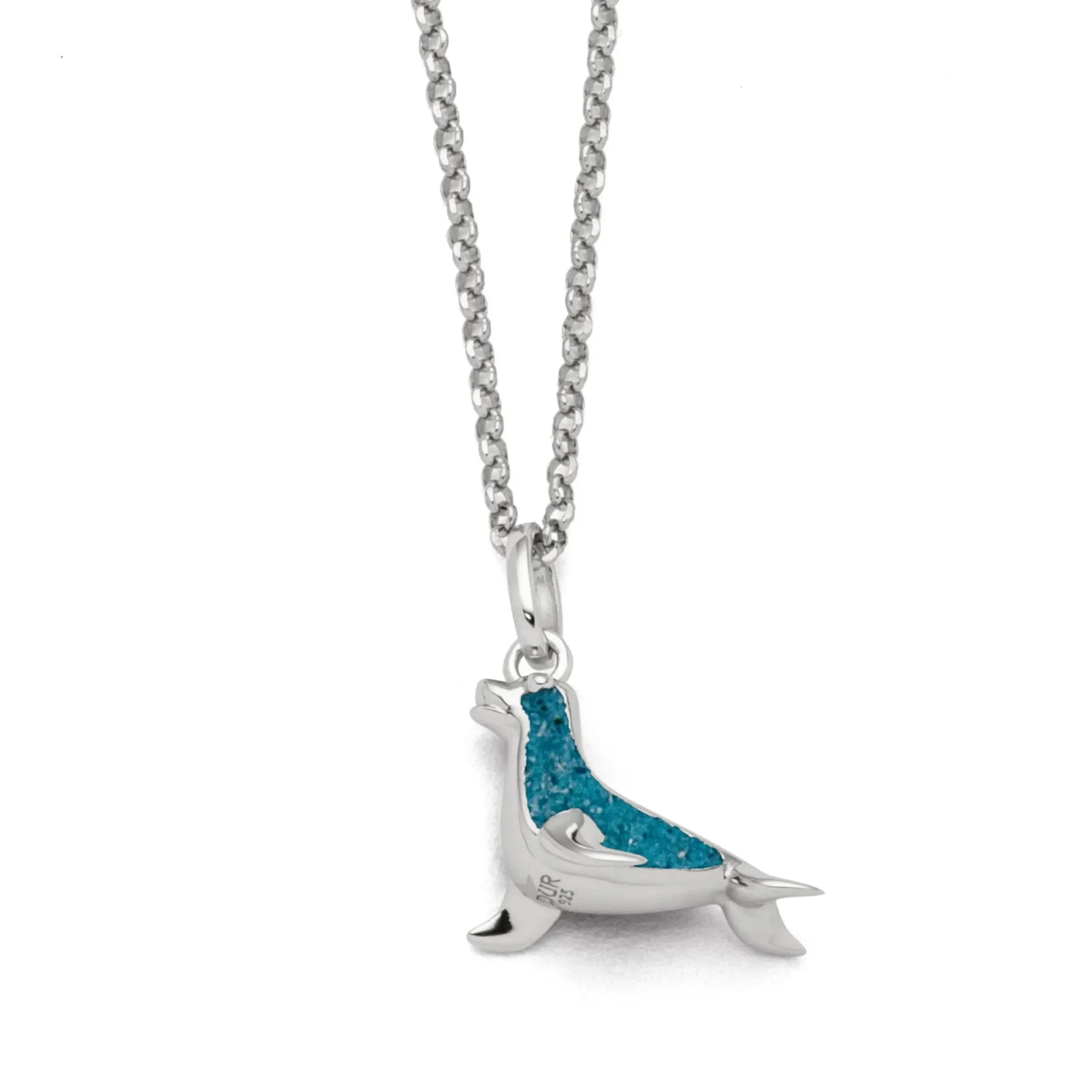 Echte Sehnsucht: Feine Erbskette rhodiniert mit einem Anhänger in Form eines Seehundes, gefüllt mit blauem Kyanitsteinsand, alles aus poliertem und rhodiniertem 925er Sterling-Silber, ca. 45 cm lang. Durch die Rhodinierung ist das Schmuckstück anlaufgeschützt.