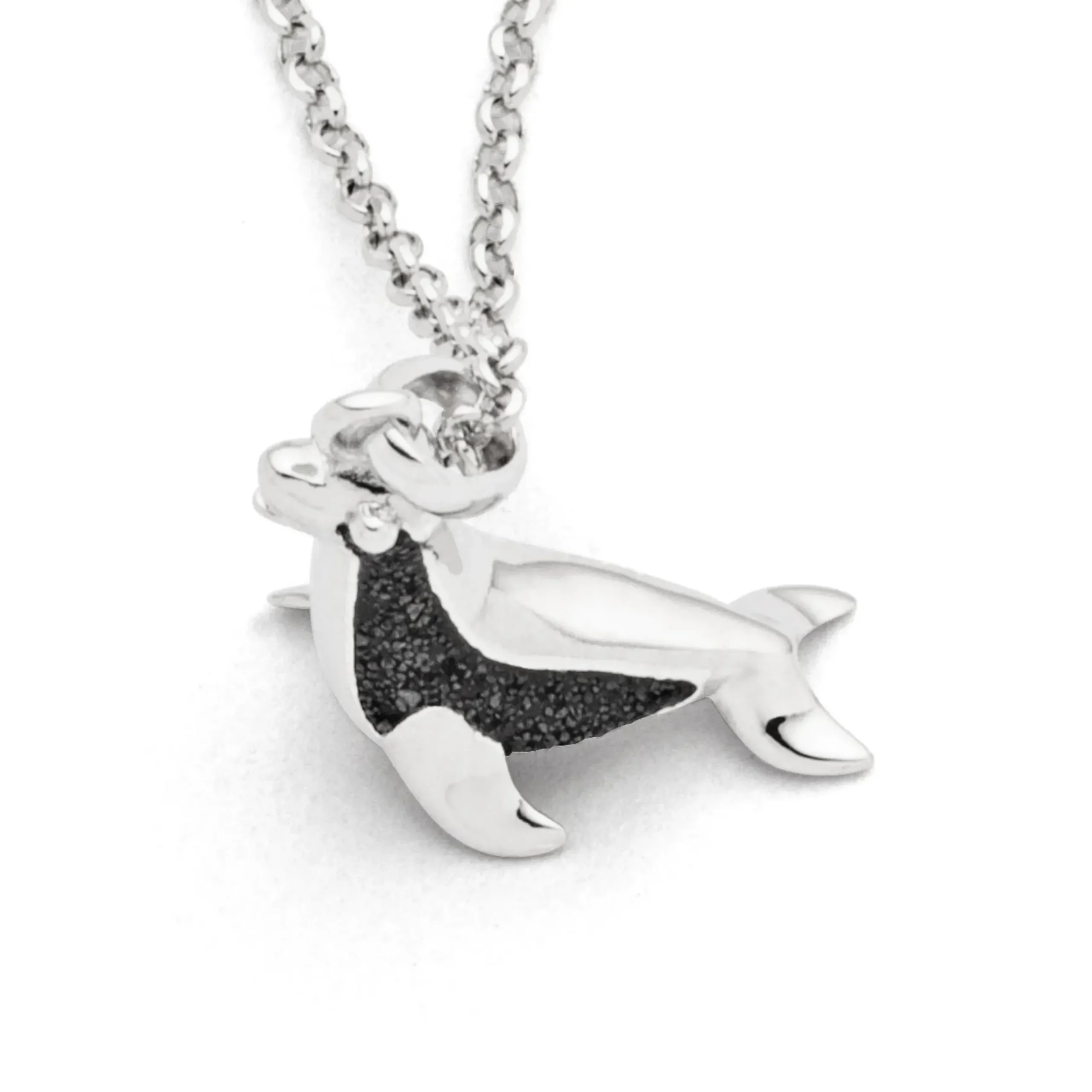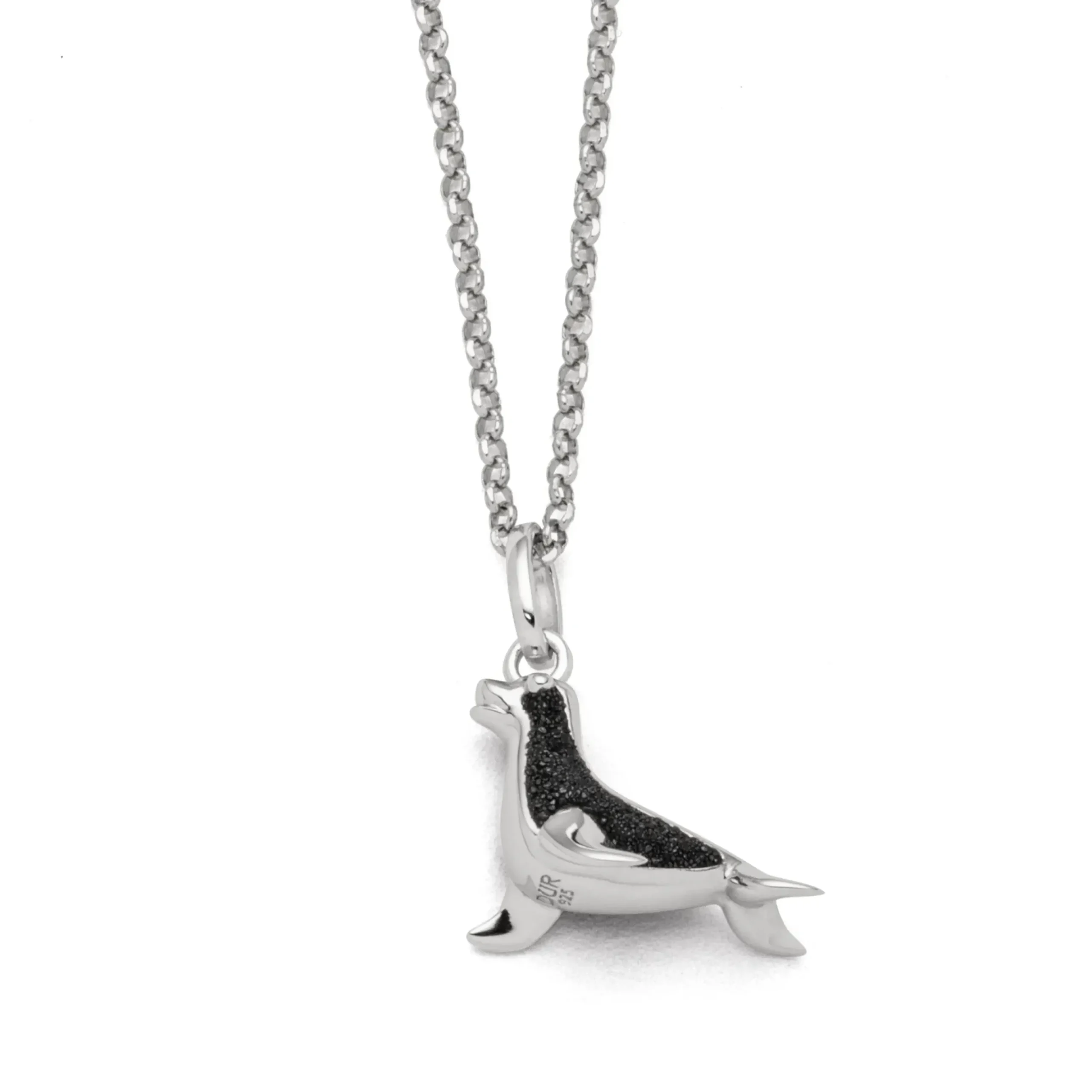 Echte Sehnsucht: Feine Erbskette rhodiniert mit einem Anhänger in Form eines Seehundes, gefüllt mit Lavasand, alles aus poliertem und rhodiniertem 925er Sterling-Silber, ca. 42 cm lang. Durch die Rhodinierung ist das Schmuckstück anlaufgeschützt.