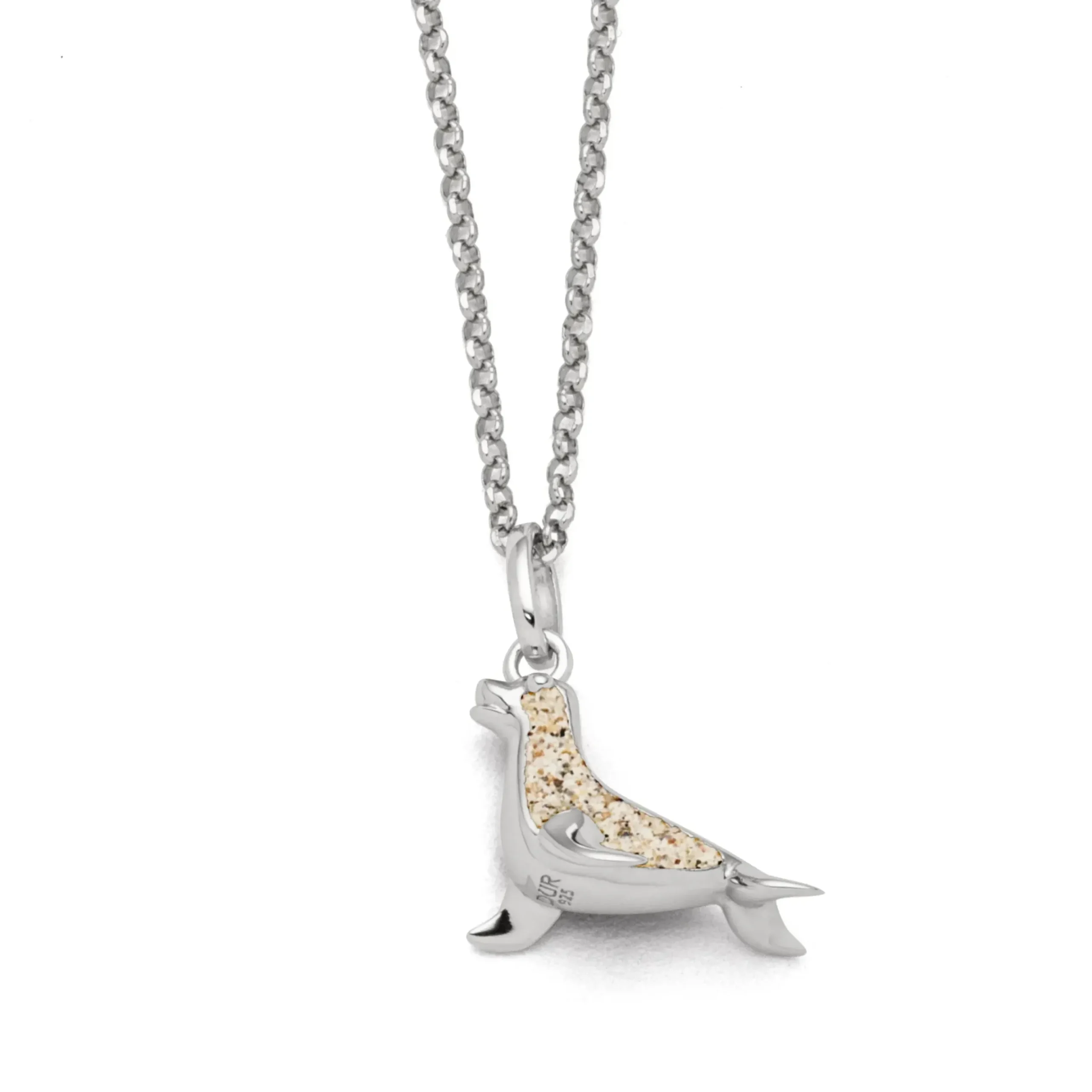 Echte Sehnsucht: Feine Erbskette rhodiniert mit einem Anhänger in Form eines Seehundes, gefüllt mit Strandsand, alles aus poliertem und rhodiniertem 925er Sterling-Silber, ca. 45 cm lang. Durch die Rhodinierung ist das Schmuckstück anlaufgeschützt.