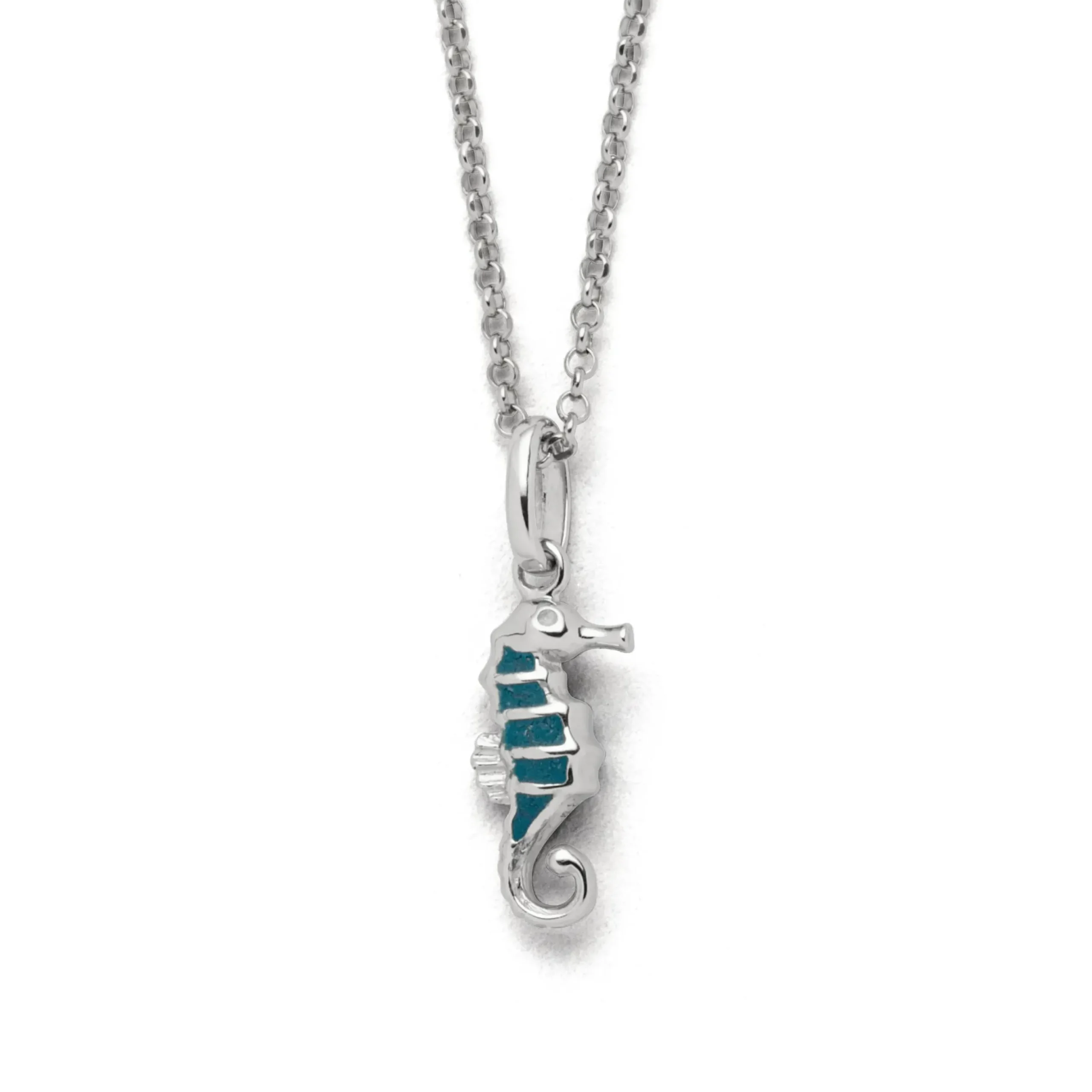 Echte Sehnsucht: Feine Erbskette rhodiniert mit einem Anhänger in Form eines Seepferdes, gefüllt mit blauem Kyanitsteinsand, alles aus poliertem und rhodiniertem 925er Sterling-Silber, ca. 42 cm lang. Durch die Rhodinierung ist das Schmuckstück anlaufgeschützt.