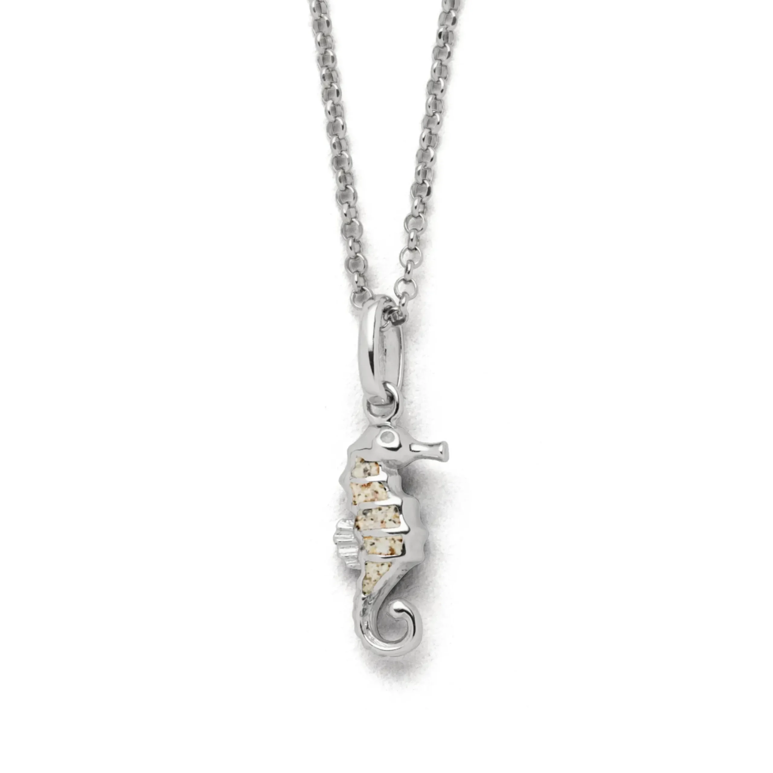 Echte Sehnsucht: Feine Erbskette rhodiniert mit einem Anhänger in Form eines Seepferdes, gefüllt mit Strandsand, alles aus poliertem und rhodiniertem 925er Sterling-Silber, ca. 45 cm lang. Durch die Rhodinierung ist das Schmuckstück anlaufgeschützt.