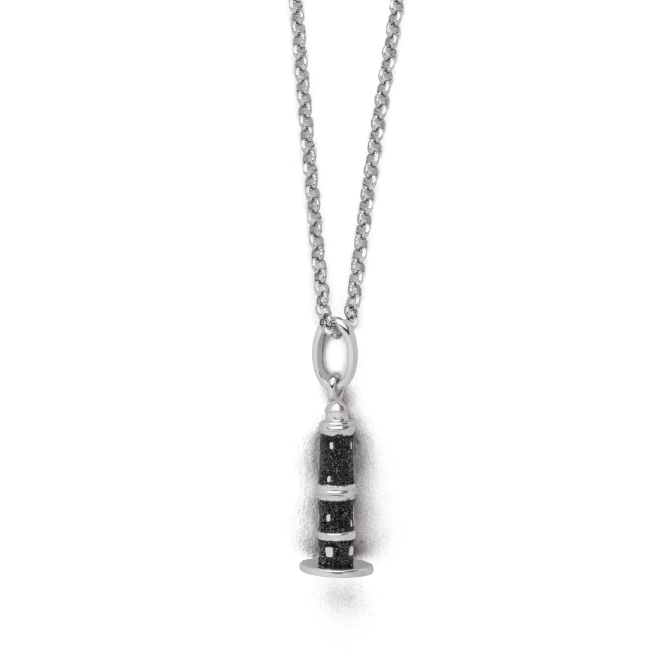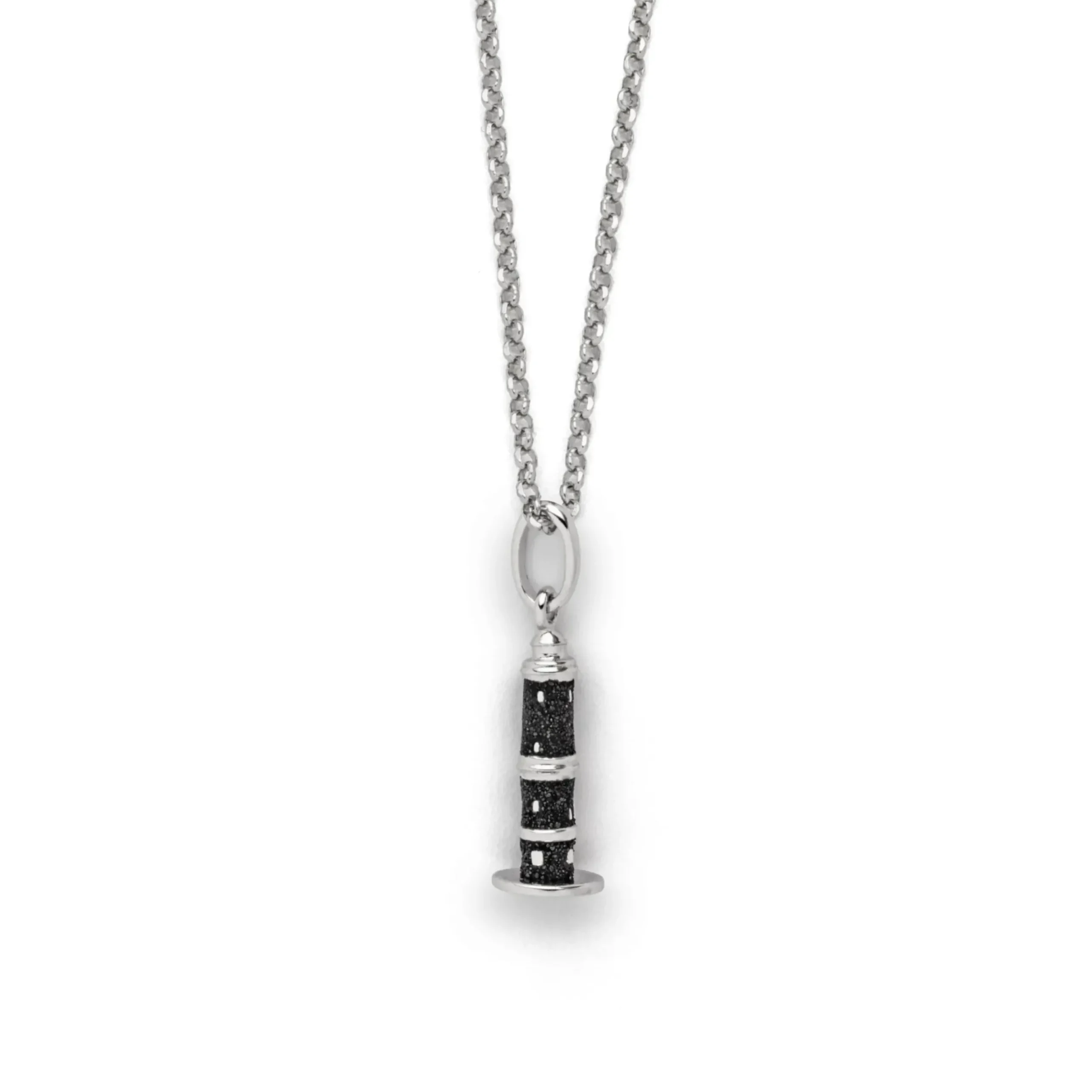 Echte Sehnsucht: Feine Erbskette rhodiniert mit dem „Warnemünder Leuchtturm“ als Anhänger,gefüllt mit Lavasand , aus poliertem und rhodiniertem 925er Sterling-Silber, ca. 42 cm lang. Durch die Rhodinierung ist das Schmuckstück anlaufgeschützt.