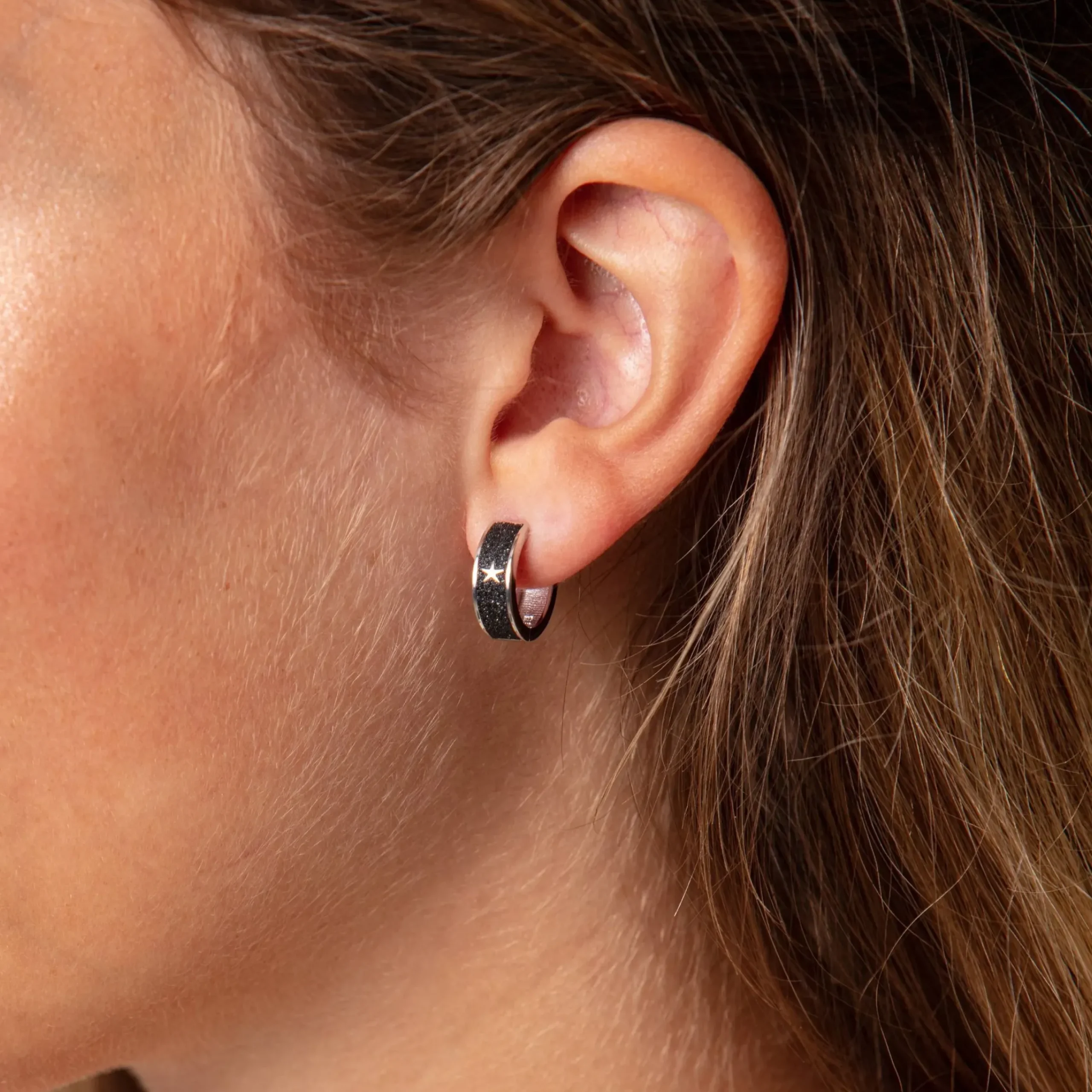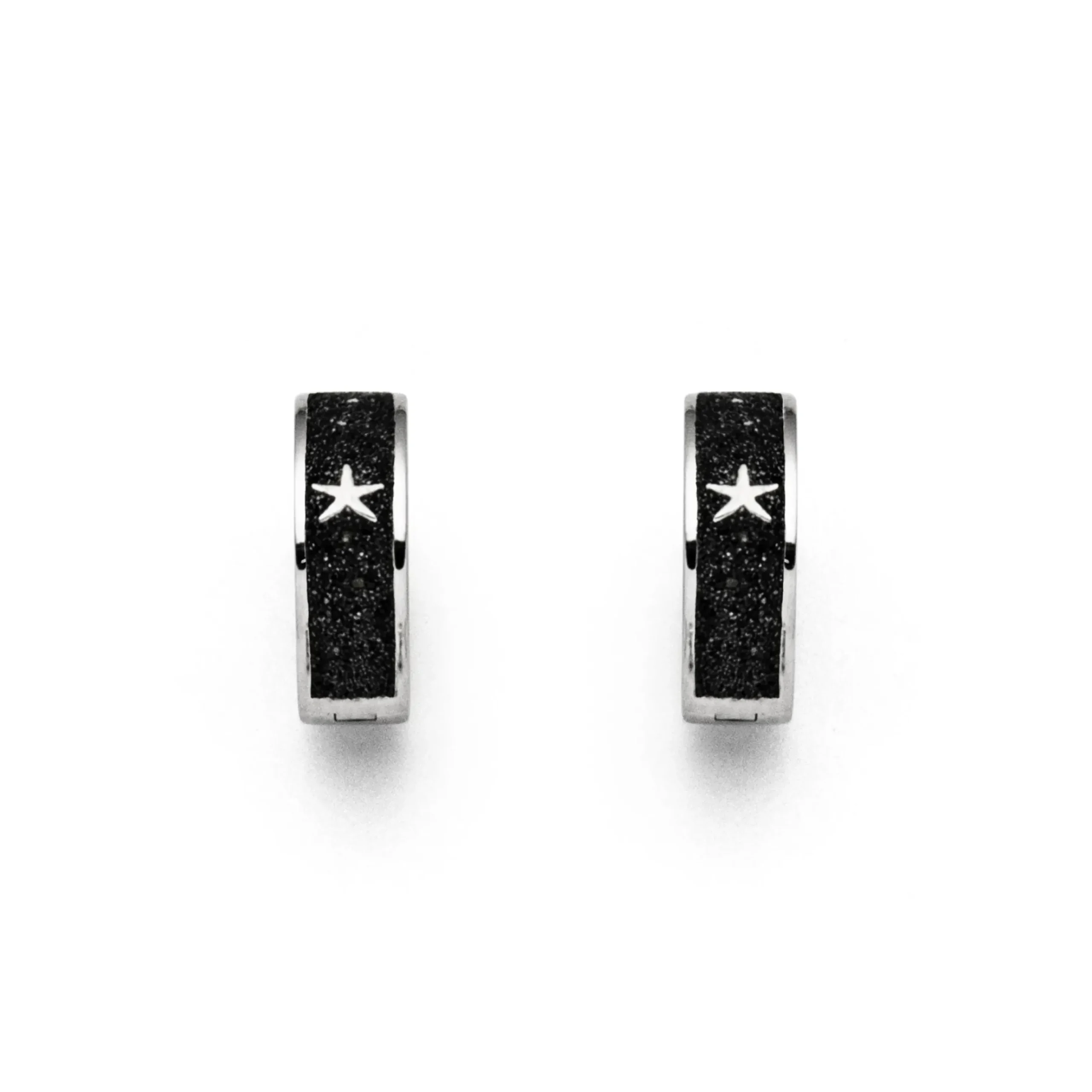 Klappcreole „Seestern“ mit einem kleinen in Lavasand gebetteten Stern, gefaßt in rhodiniertem 925er Sterlingsilber.
