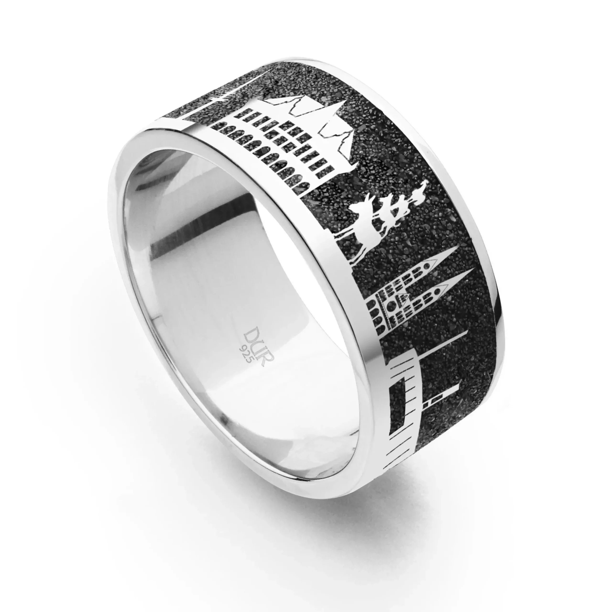Stadtmusikanten, Weserpromenade oder historisches Schnoorviertel – die charmante Hansestadt Bremen hat viel zu bieten.Als Erinnerung an einen schönen Aufenthalt, einen besonderen Lebensabschnitt, oder für alle, die ihre Verbundenheit zu Bremen stilvoll zum Ausdruck bringen möchten, ist dieser elegante und zeitlose Nachtring ein unverzichtbarer Begleiter.Der glanzvolle Bandring verspricht höchsten Tragekomfort durch hochwertige Materialien und überzeugt durch sein klares Design, sowie eine hohe Symbolik, die ihn für jeden Tragenden einzigartig macht.Auf dem schwarzen Band des funkelnden Lavasands sind formschön verschiedene Motive eingearbeitet (Universum, Fernmeldeturm, Rathaus, Bremer Stadtmusikanten, Dom, Weserstadion, Roland), welche die Vielfältigkeit des Bremer Lebens auf zauberhafte Weise einfangen.Der geschmackvolle Kontrast zwischen poliertem, rhodiniertem Silber, sowie dem tiefschwarz funkelndem Lavasand, zieht alle Blicke auf sich und erinnert an eine sternenklare Nacht in Bremen.Funkeln sie mit diesem entzückenden Schmuckstück um die Wette und tragen Sie immer einen Teil Ihrer Stadt ganz nah bei sich.