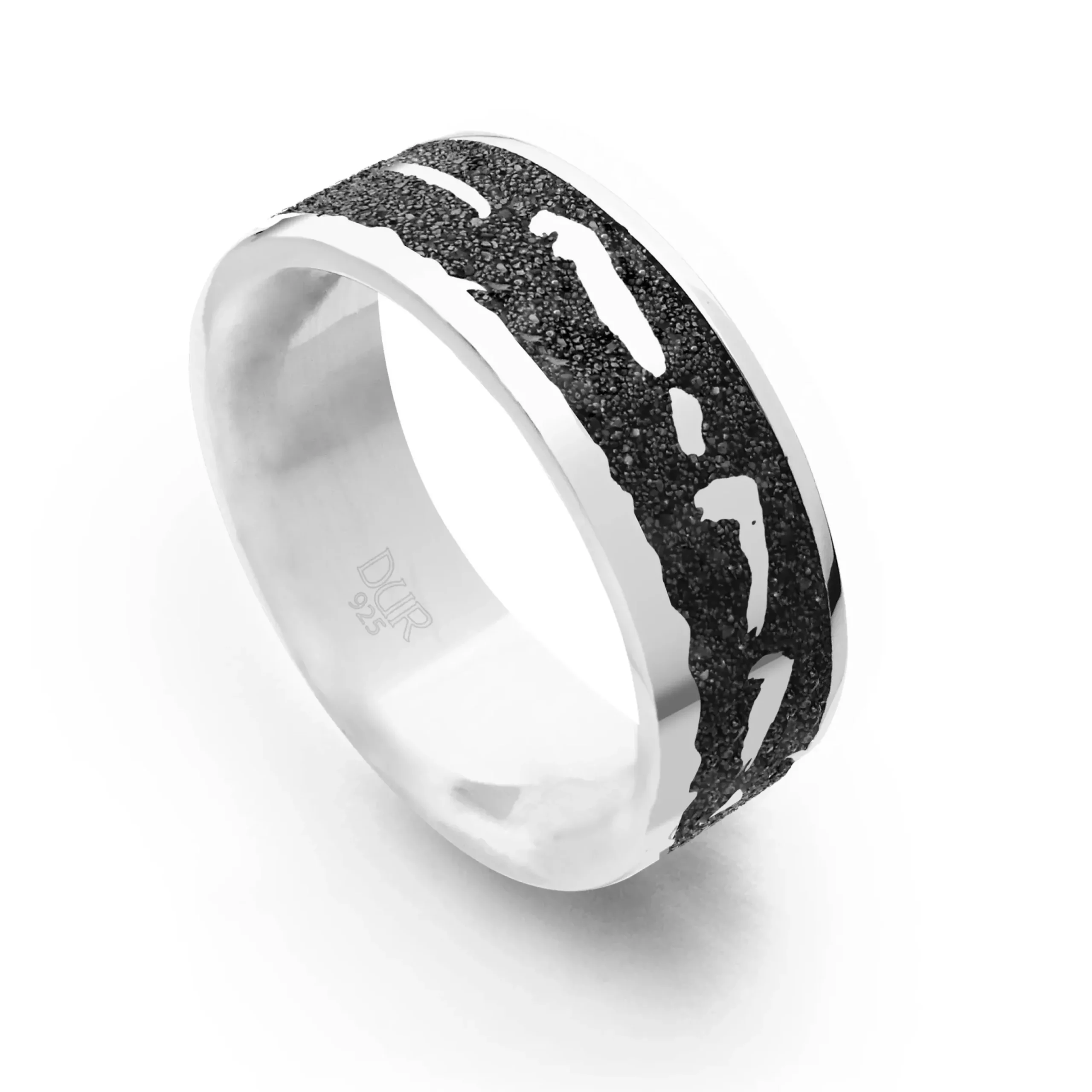Nachtring „Nordsee“ 7 mm mit den Silhouetten der Nordseeinseln:Borkum, Juist, Norderney, Baltrum, Langeoog, Spiekeroog, Wangerooge, eingebettet in Lavasand und gefasst in rhodiniertem 925er Sterling-Silber.