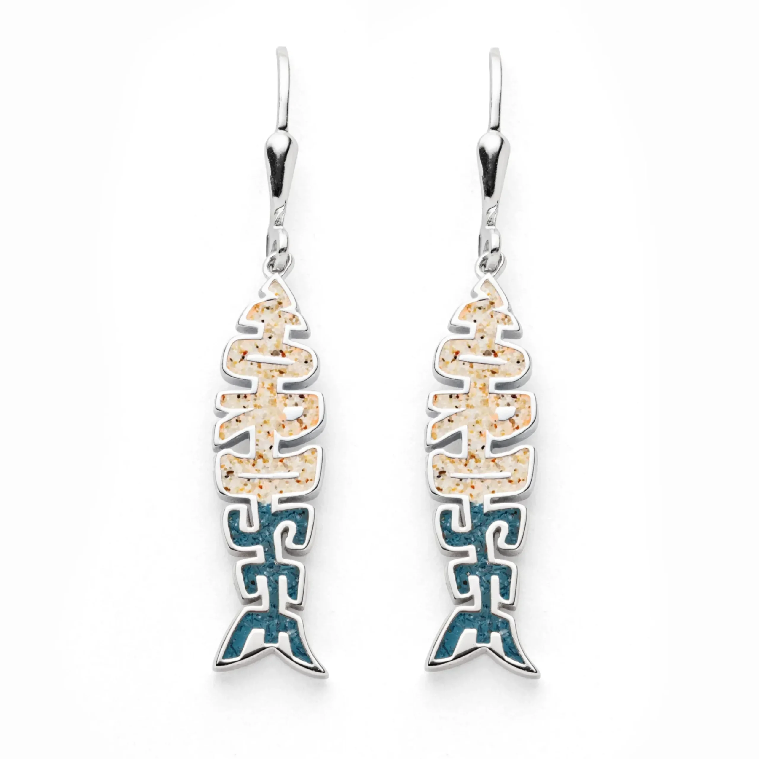 Ohrhänger Fischgräte mit „Nordsee“- Schriftzug in Fischform, gefüllt mit Strandsand+blauem Steinsand (aus Kyanitstein) und alles aus poliertem, rhodiniertem 925er Sterlingsilber.