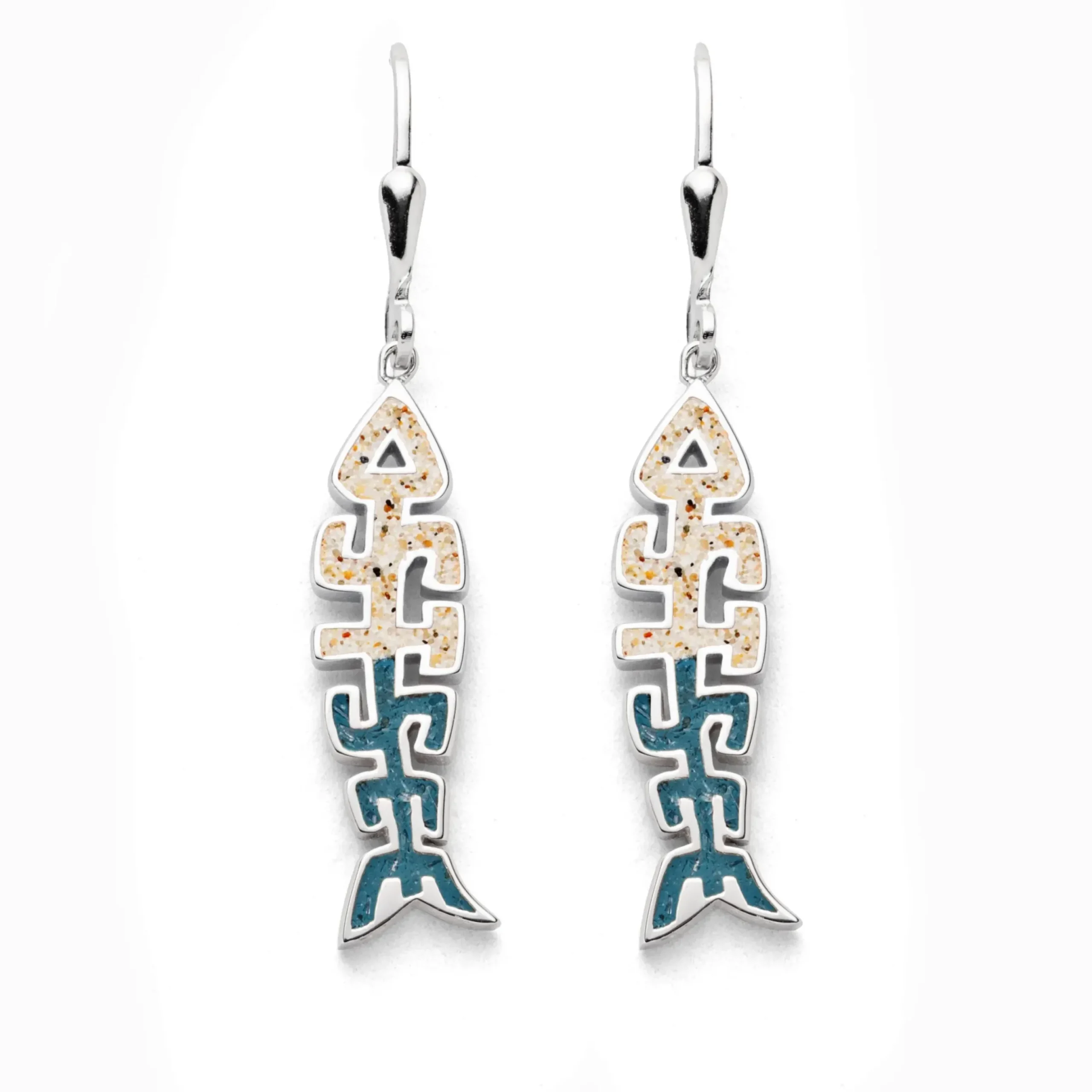 Ohrhänger Fischgräte mit „Ostsee“- Schriftzug in Fischform, gefüllt mit Strandsand+blauem Steinsand (aus Kyanitstein) und alles aus poliertem, rhodiniertem 925er Sterlingsilber.