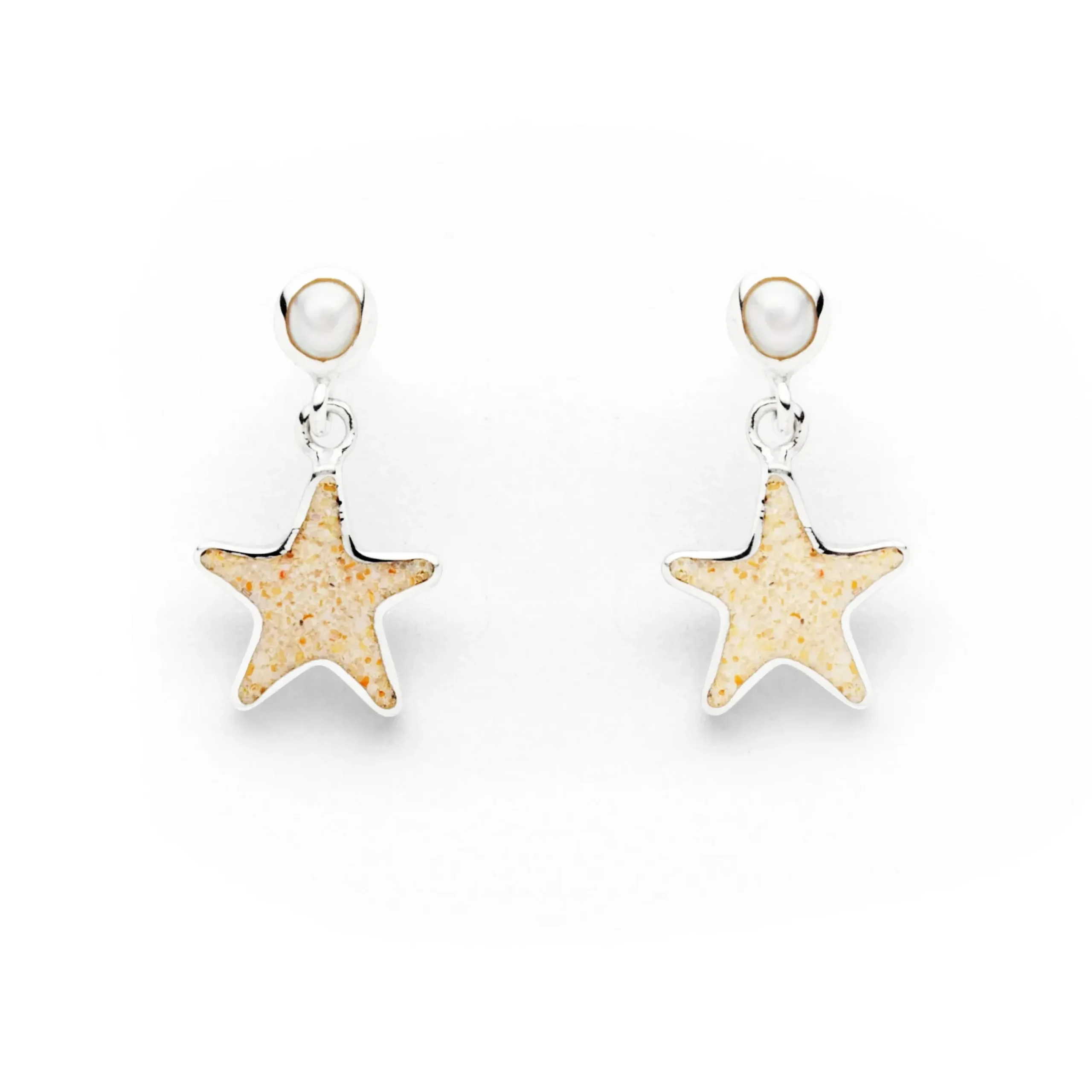 Handgefertigte Ohrhänger in Form eines Seesterns, gefüllt mit Strandsand, sowie einer Süßwasserperle, alles gefasst in 925er Sterling-Silber