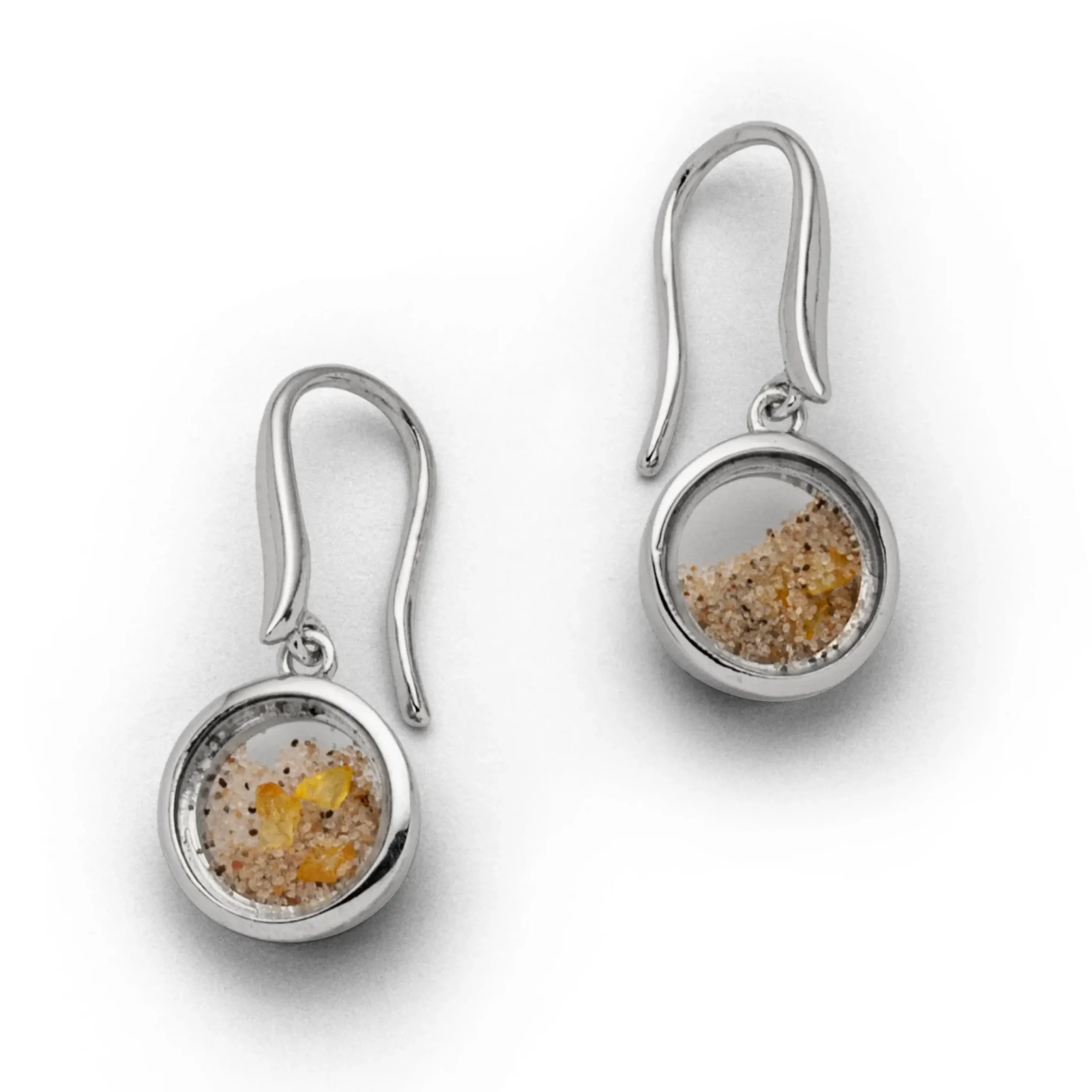 Kleiner runder Ohrhänger „Sandsturm II „, gefüllt mit losem Strandsand und Bernsteinstückchen. Transparent eingearbeitet in Glas und gefasst in rhodiniertem 925er Sterling-Silber. Durch die Rhodinierung ist das Schmuckstück anlaufgeschützt.