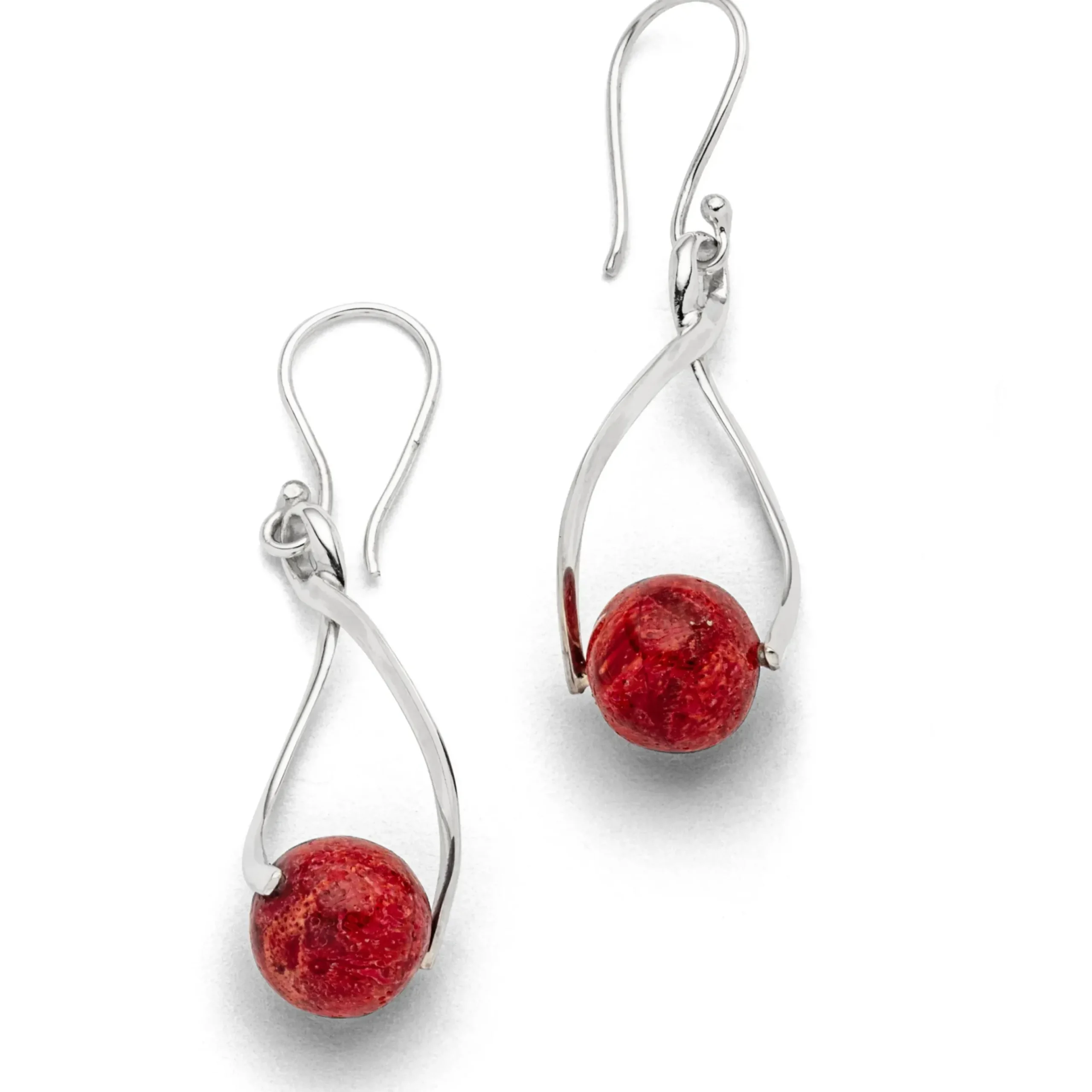Ohrhänger „Swinging“, handgefertigt, mit einer beweglichen Korallenkugel an einem gedrehten Silberelement aus 925er Sterling-Silber.