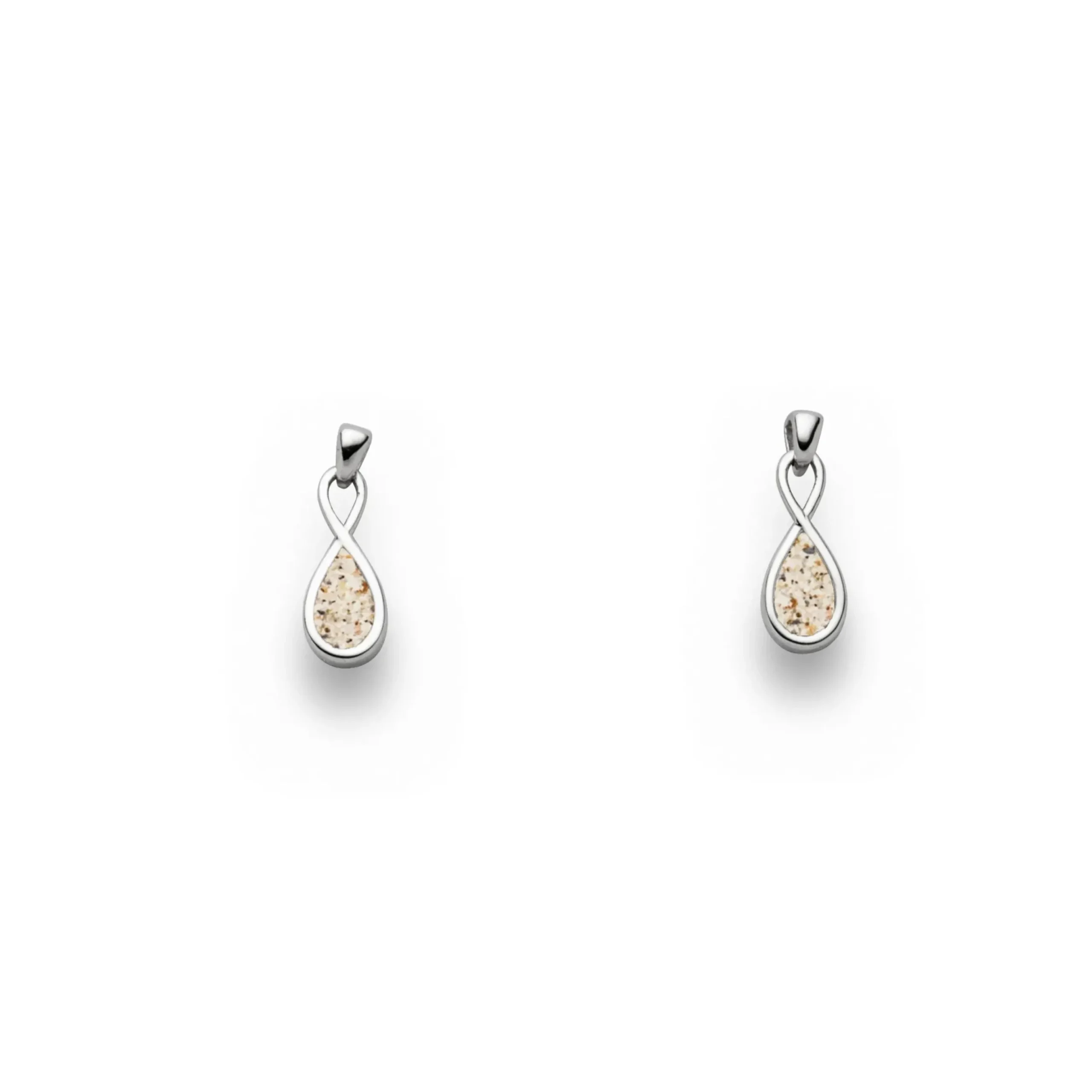 Ohrring „Forever“, kleiner Ohrring in Form einer Unendlichkeitsschleife, gefüllt mit Strandsand, gefaßt in rhodiniertem 925er Sterlingsilber.