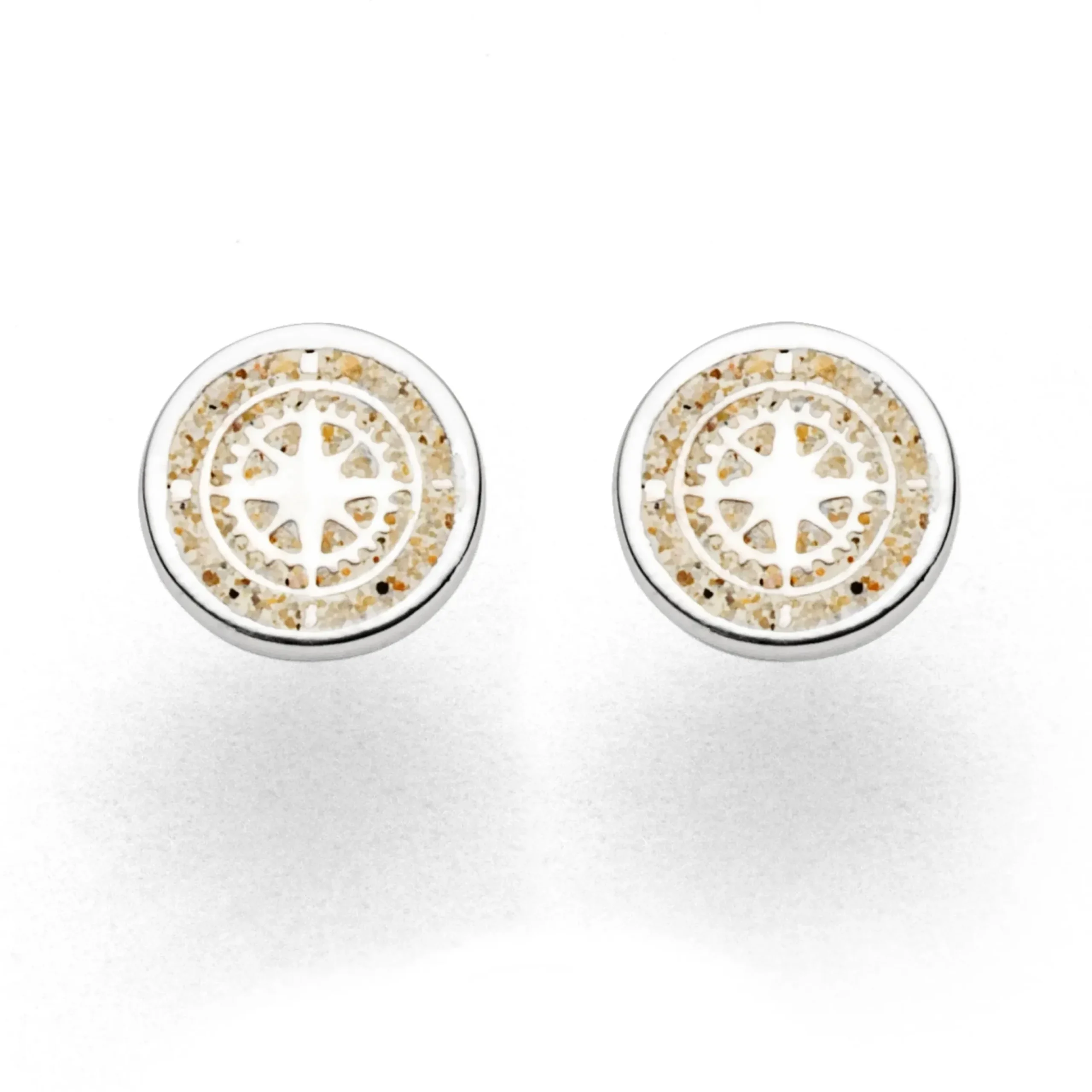 Ohrring „Kompass“, kleiner runder Ohrstecker mit einer in Strandsand eingebetteten Kompassrose, gefaßt in rhodiniertem 925er Sterlingsilber. Durch die Rhodinierung ist das Schmuckstück anlaufgeschützt.