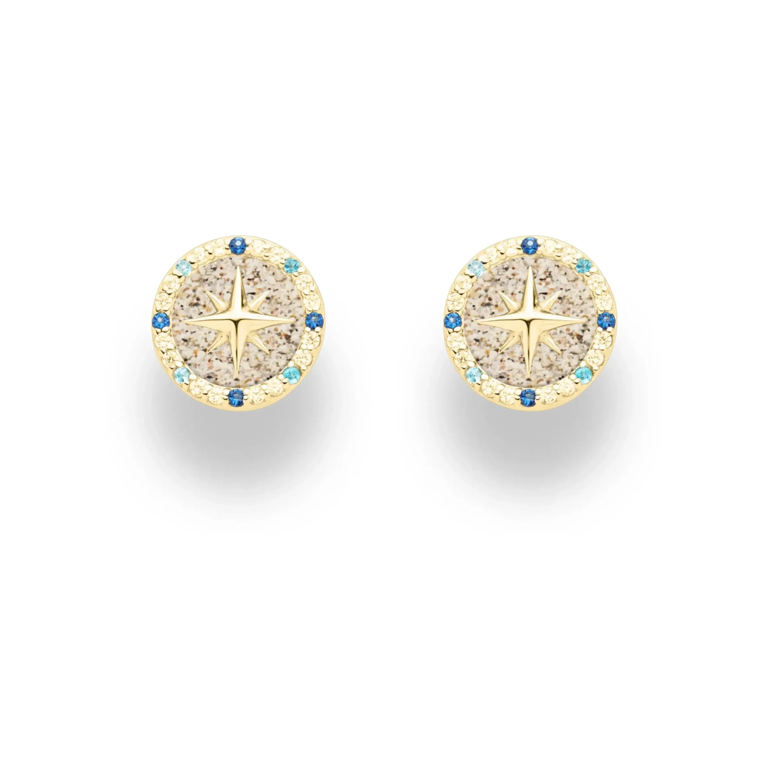 Ohrstecker „Kompassrose 2.0“ der äußere Rand ist mit Zirkoniasteinen in den Farben, weiß, hellblau und dunkelblau besetzt, innen mit Strandsand gefüllt, aus poliertem, vergoldetem 925er Sterling-Silber