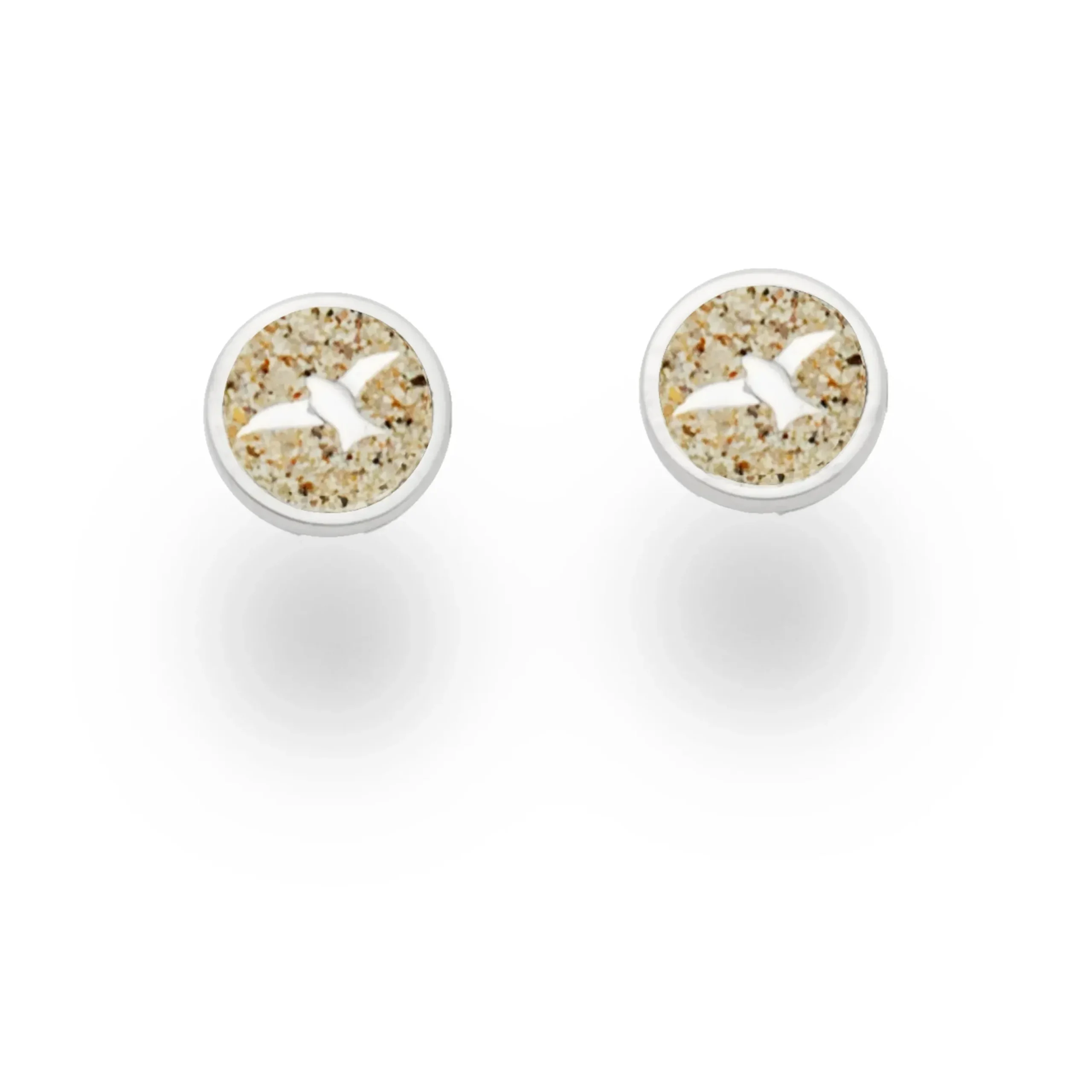 Ohrring „Möwe“, kleiner 8 mm runder Ohrstecker mit einer Möwe, eingebettet in Strandsand und gefaßt in poliertem, rhodiniertem 925er Sterlingsilber.