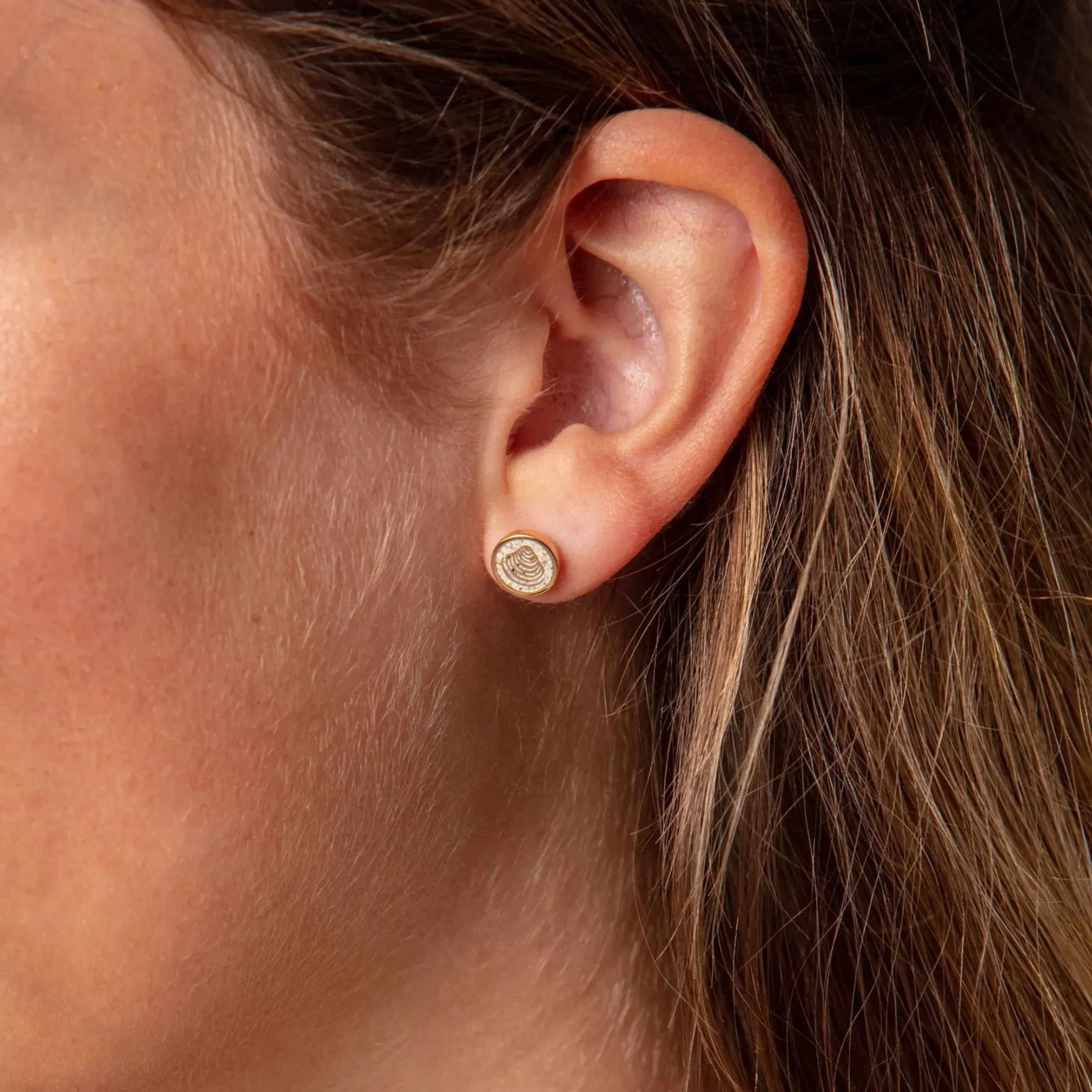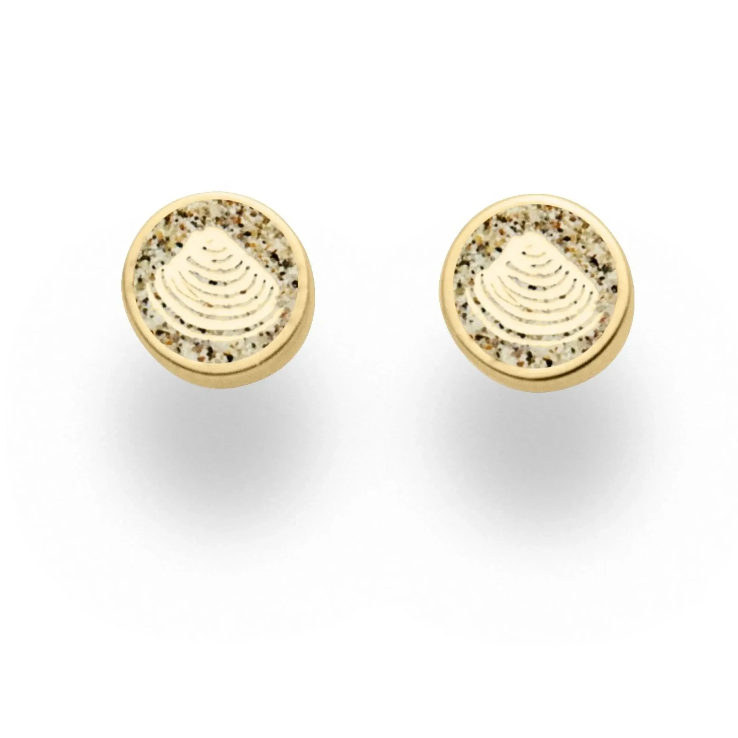 Ohrring „Muschel“, kleiner 8 mm runder Ohrstecker mit einer Muschel, eingebettet in Strandsand und gefaßt in vergoldetem 925er Sterlingsilber.