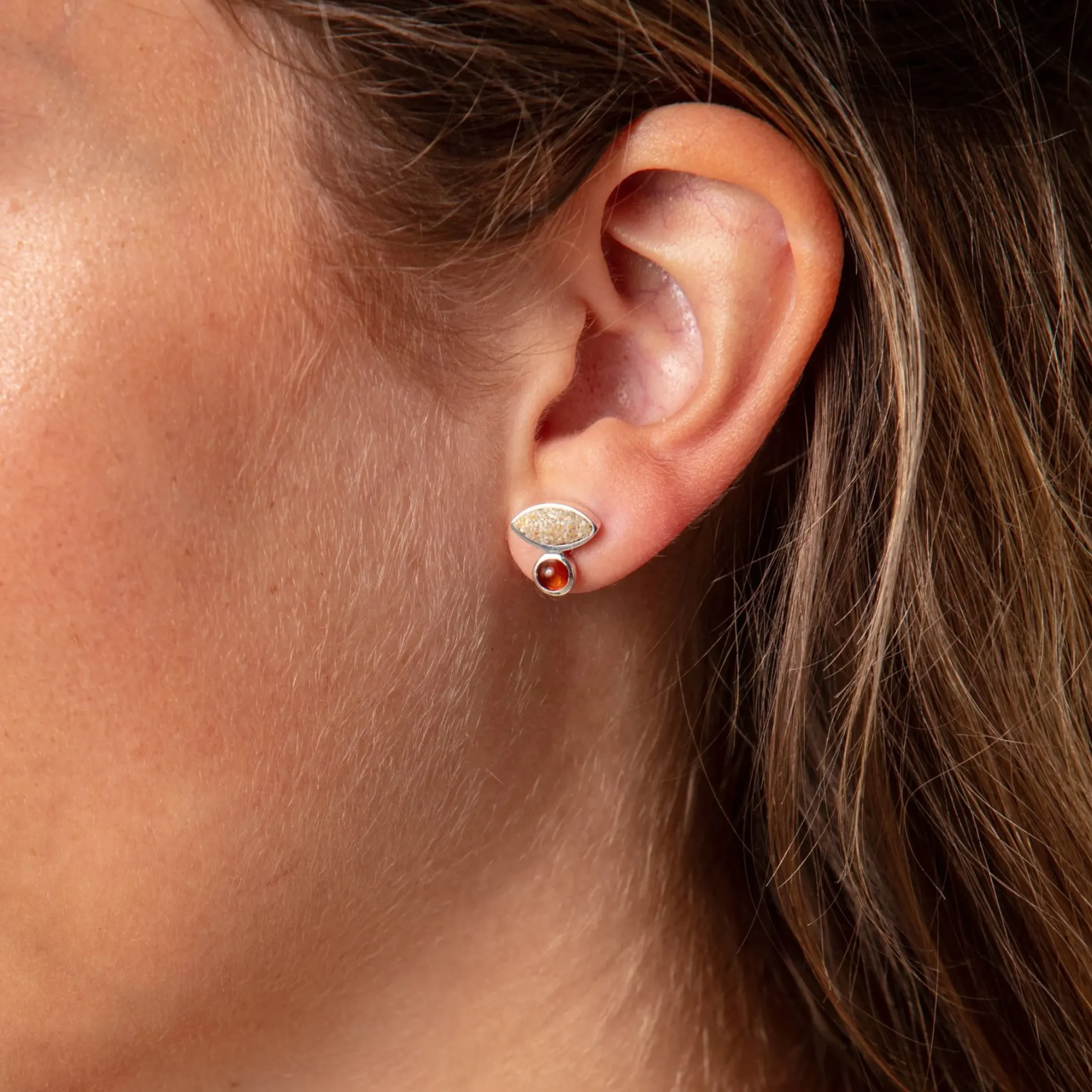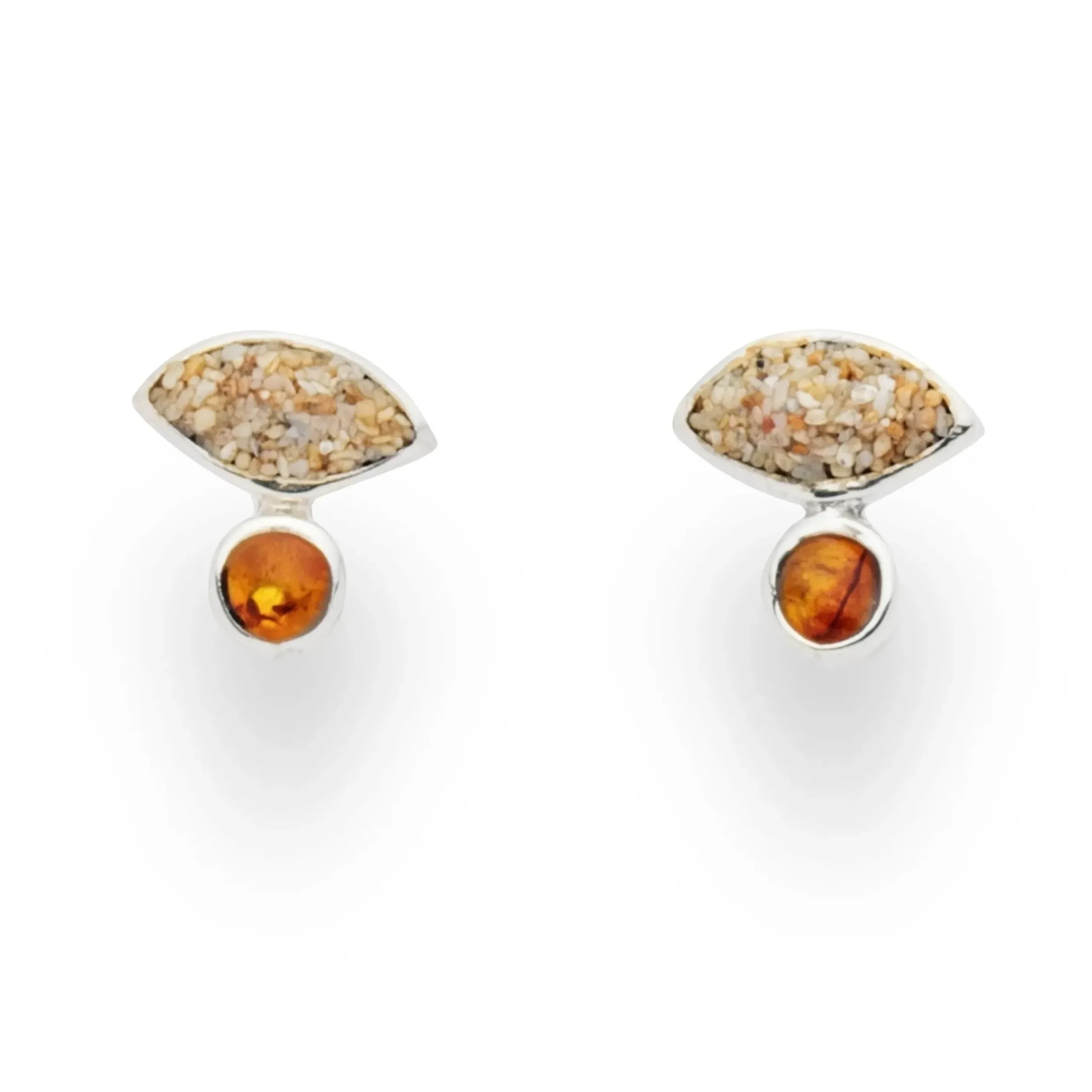 Ohrring „Sandbank“ mit einem spitz-ovalen Strandsand -Element und einem kleinen runden Bernstein, gefaßt in 925er Sterling-Silber