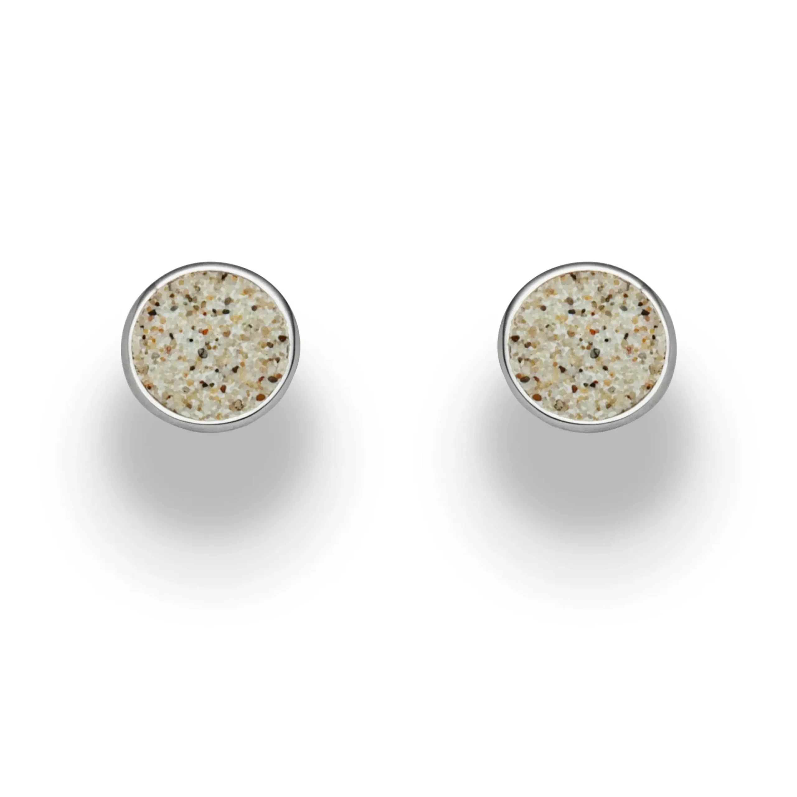 Kleiner runder Ohrstecker „Sandschale 2.0“ gefüllt mit Strandsand und gefasst in rhodiniertem 925er Sterling-Silber