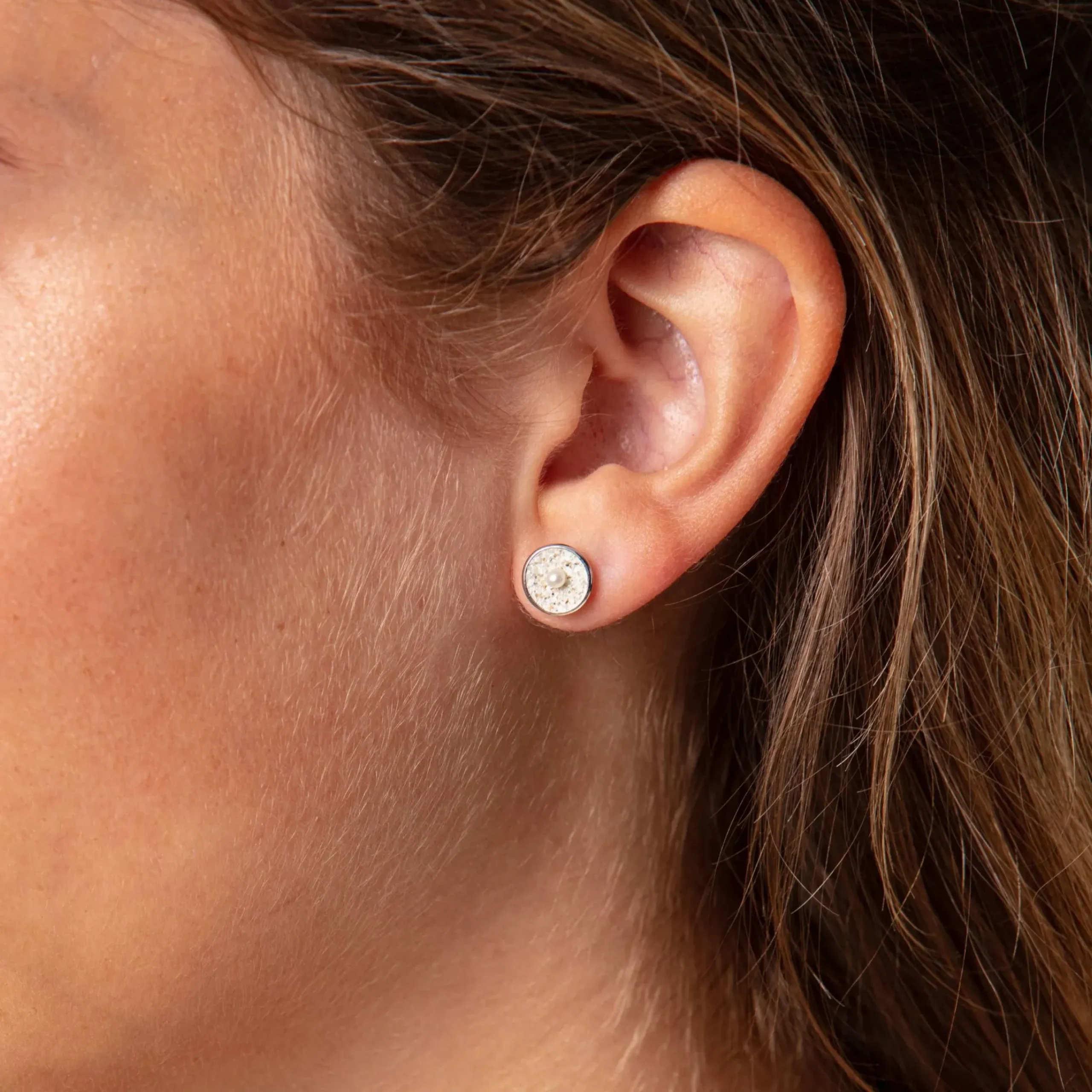 Kleiner runder Ohrstecker „Sandschale“, gefüllt mit Strandsand und einer mittig eingesetzten Süßwasserperle. Gefasst in rhodiniertem 925er Sterling-Silber. Durch die Rhodinierung ist das Schmuckstück anlaufgeschützt.