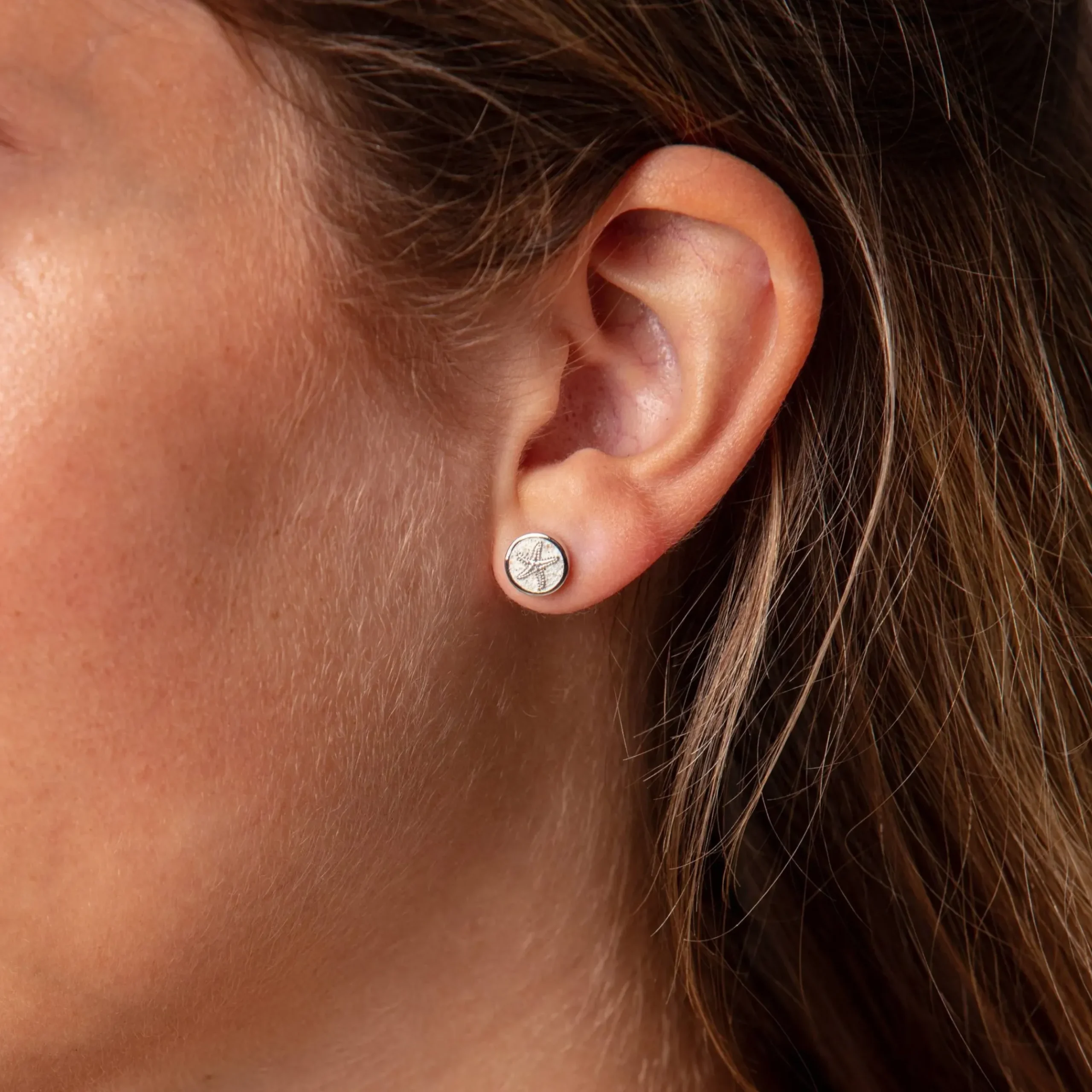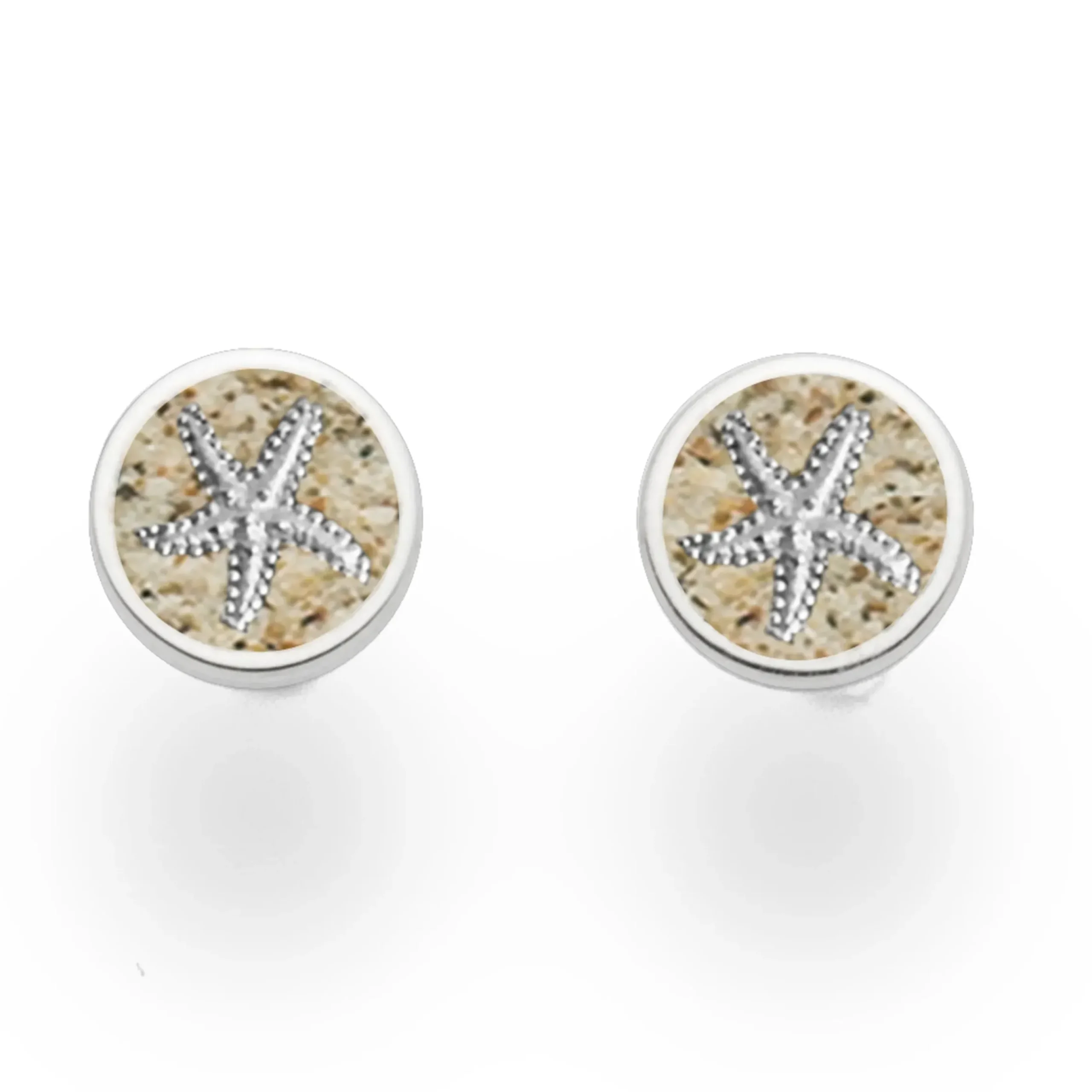 Ohrring „Seestern 2.0“, kleiner, runder Ohrstecker mit einem mattierten Seestern, eingebettet in Strandsand und gefasst in poliertem, rhodiniertem 925er Sterling-Silber.