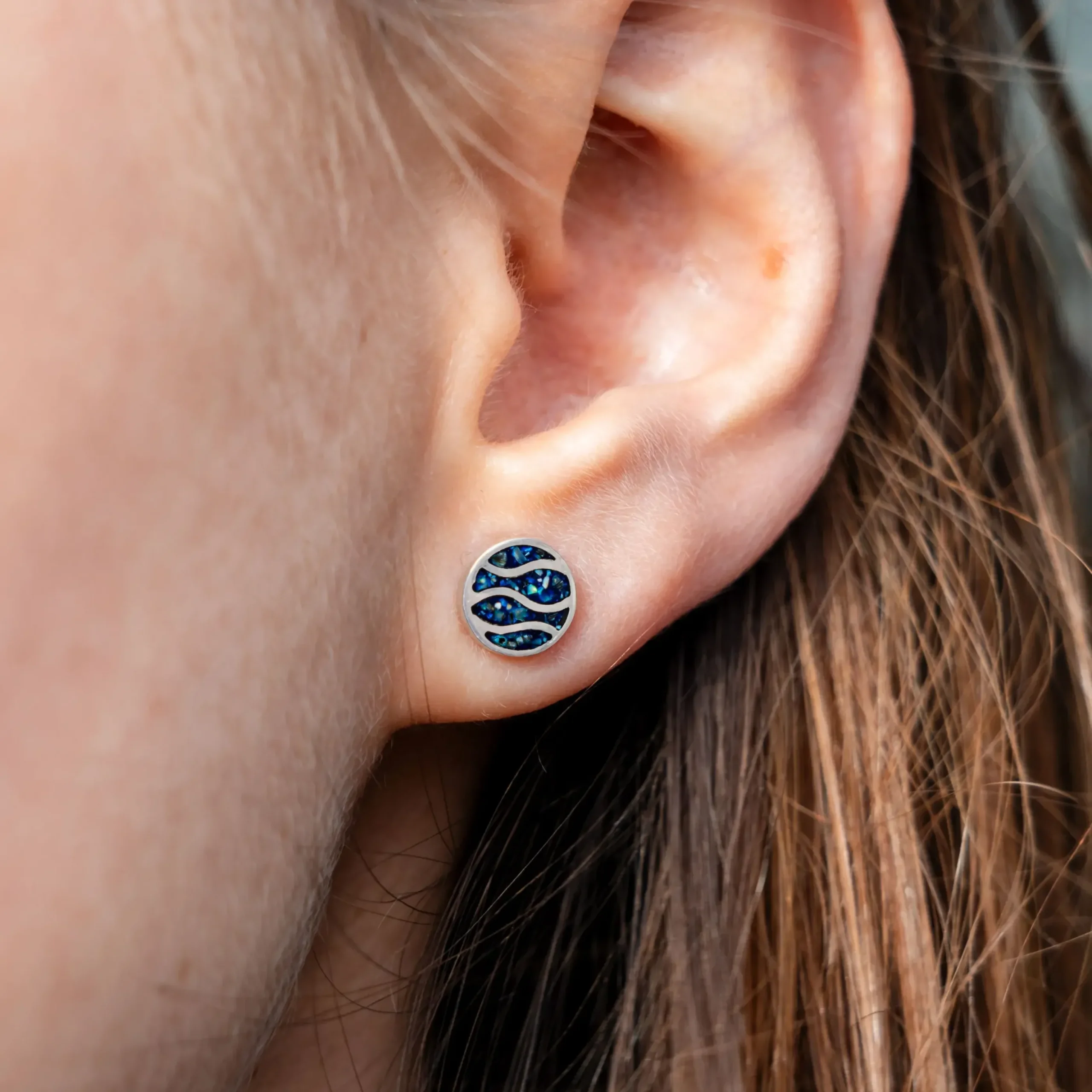 Ohrstecker „Strandwellen“, rund mit Wellenmuster, gefüllt mit Mosaik-Seeopal, aus 925er Sterlingsilber