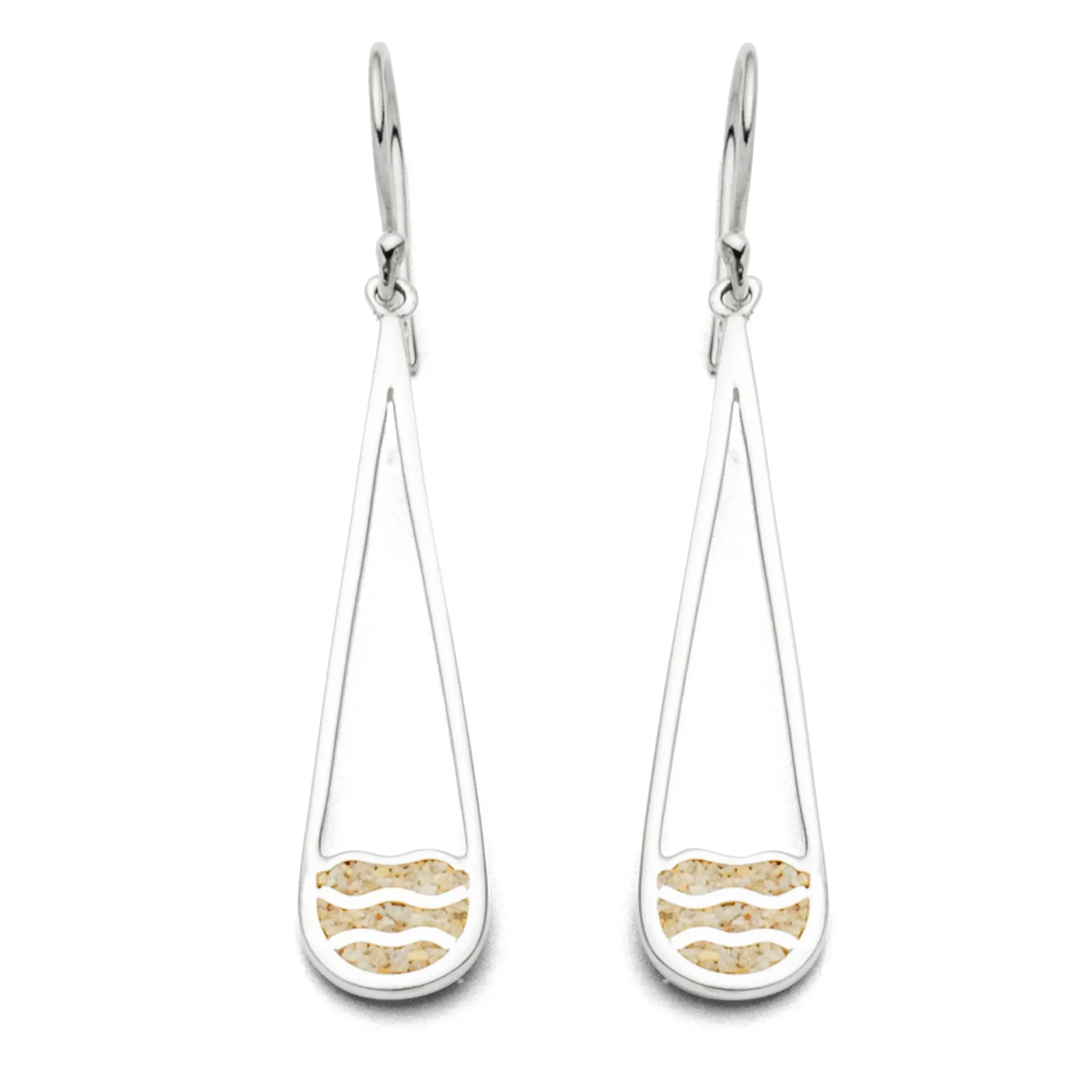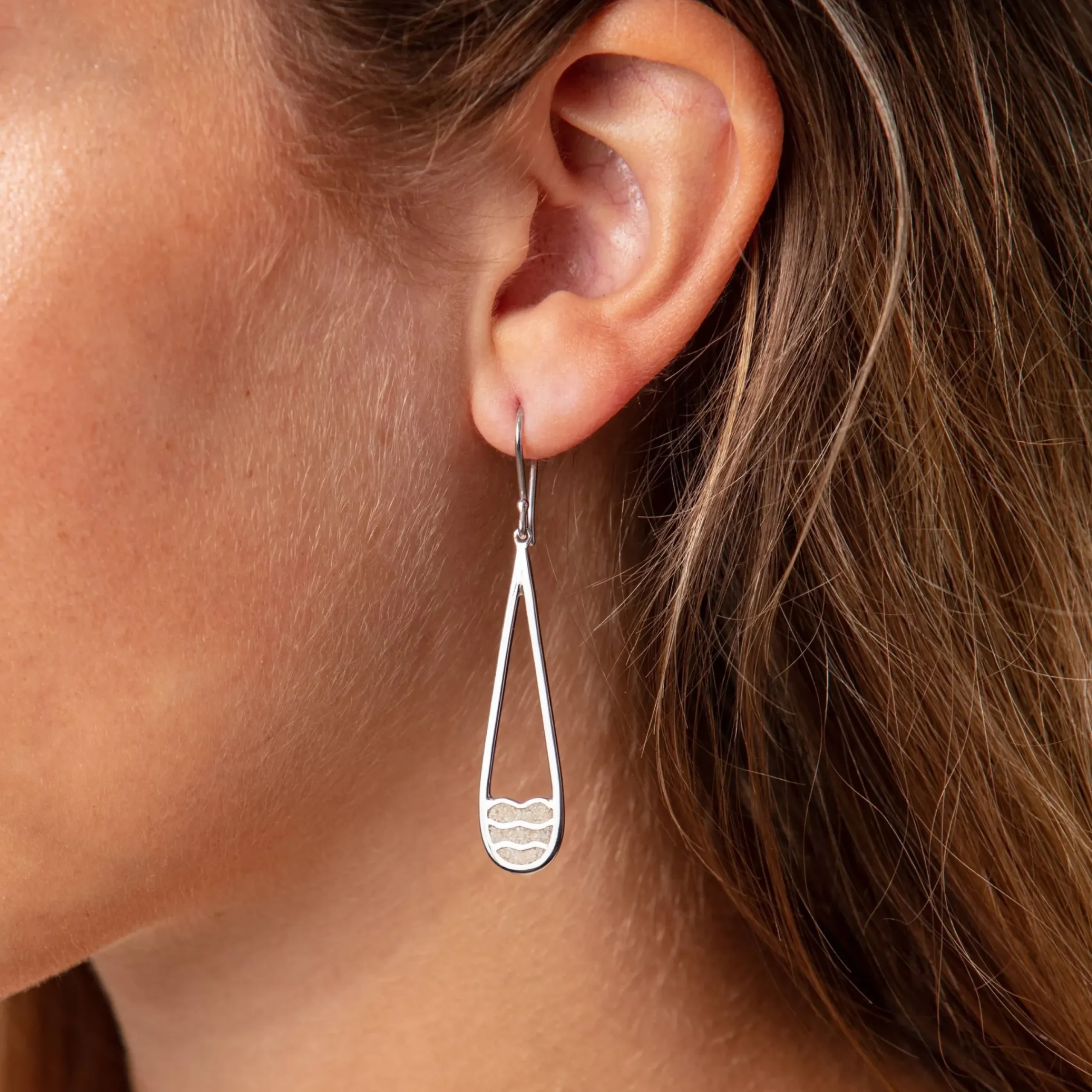 Langer und zierlicher Ohrhänger „Strandwellen“, mit tropfenförmiger Form. Im unteren Teil verziert ein Wellenmuster den mit Strandsand gefüllten Ohrhänger. Gefasst in rhodiniertem 925er Sterlingsilber. Durch die Rhodinierung ist das Schmuckstück anlaufgeschützt.