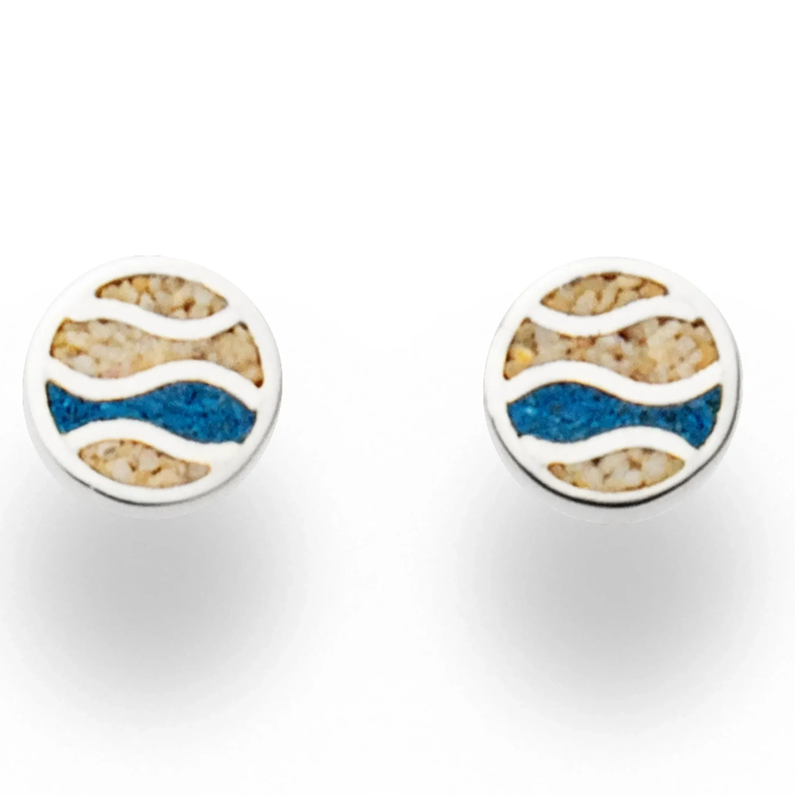 Ohrstecker „Strandwellen“, weißblau, rund mit Wellenmuster, gefüllt mit blauem Steinsand und Strandsand, aus rhodiniertem 925er Sterlingsilber