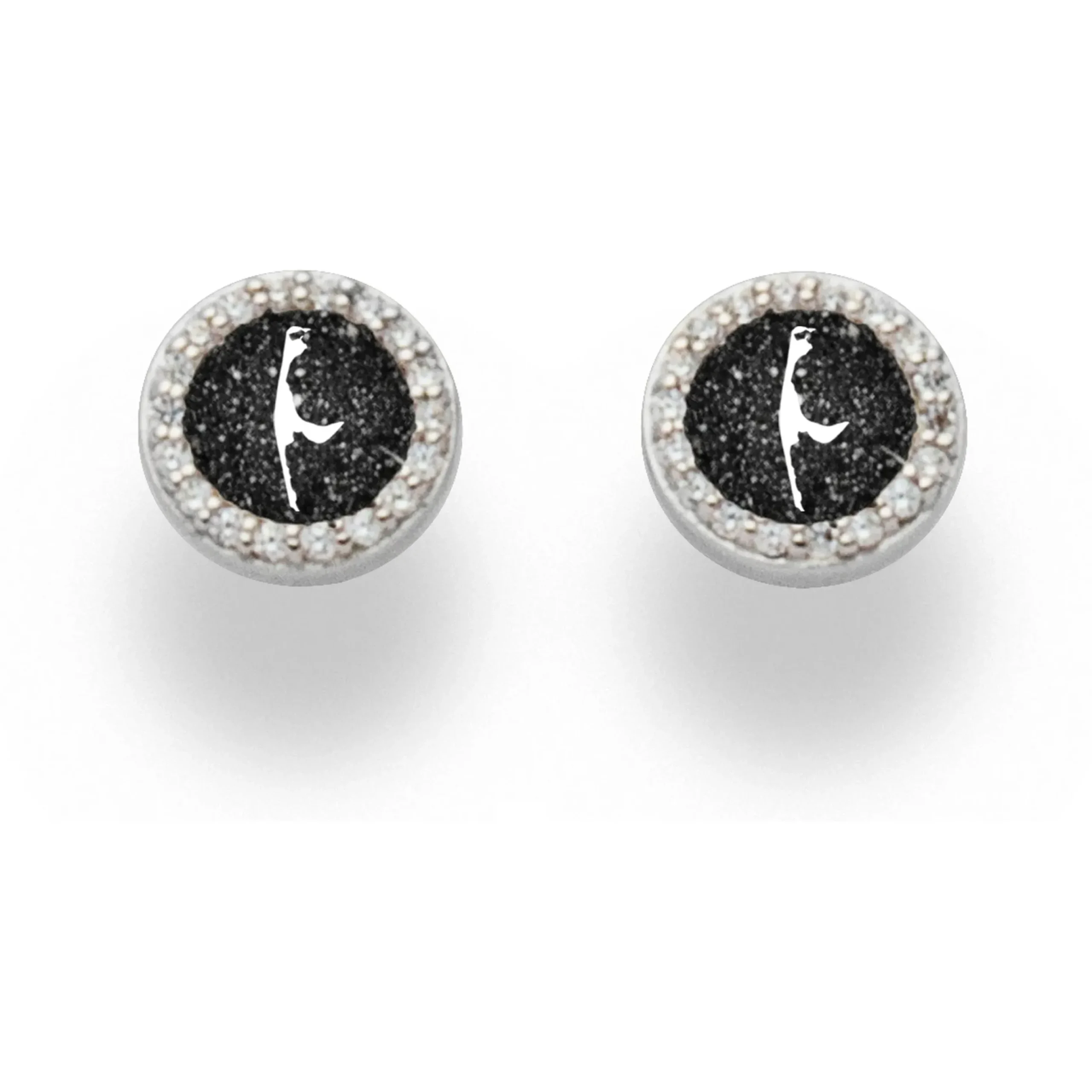 Runder Ohrring „Sylt“, mit der Silhouette von Sylt als Motiv, gefüllt mit Lavasand und umrahmt von 36 kleinen Zirkoniasteinen, gefasst in rhodiniertem 925er Sterling-Silber. Durch die Rhodinierung ist das Schmuckstück anlaufgeschützt.