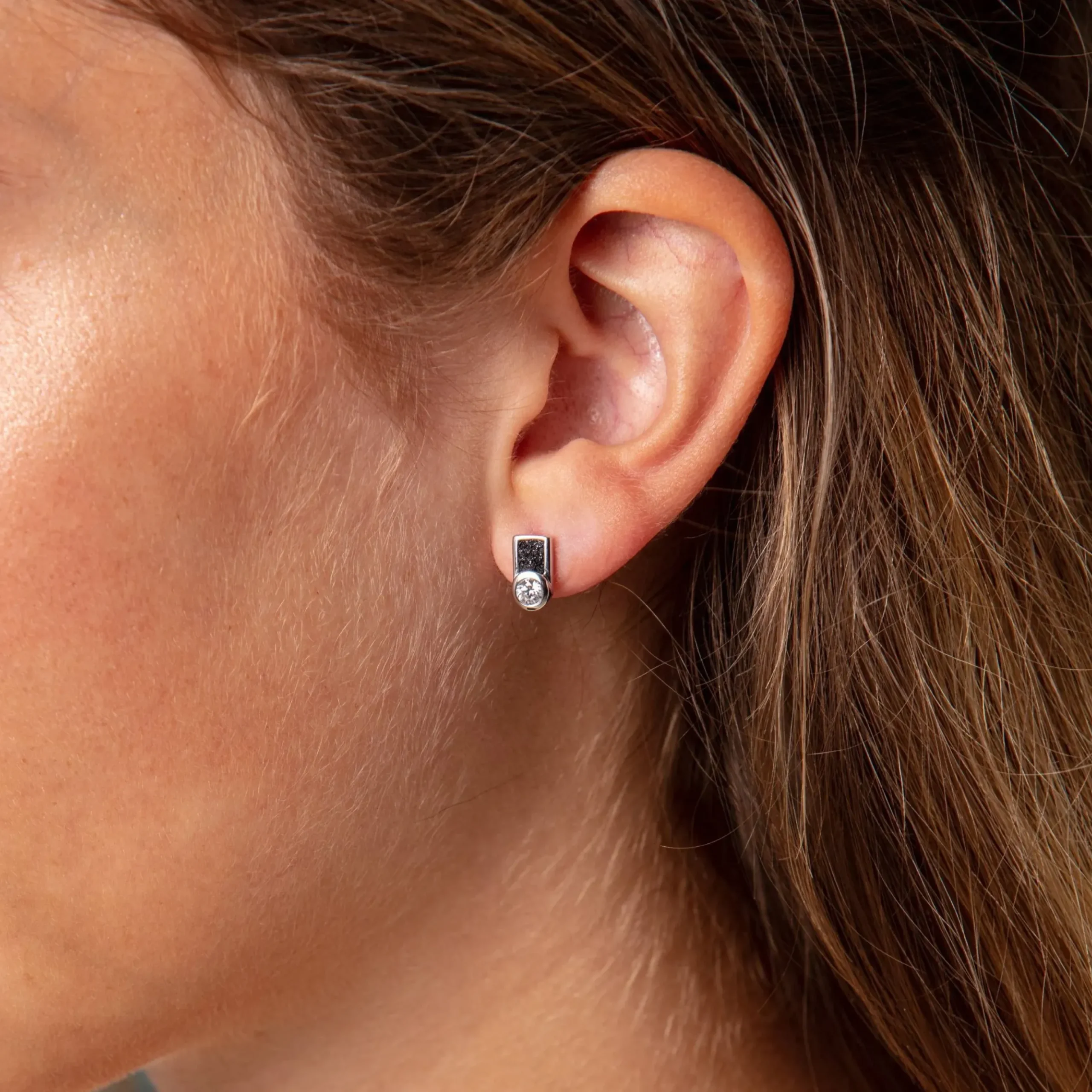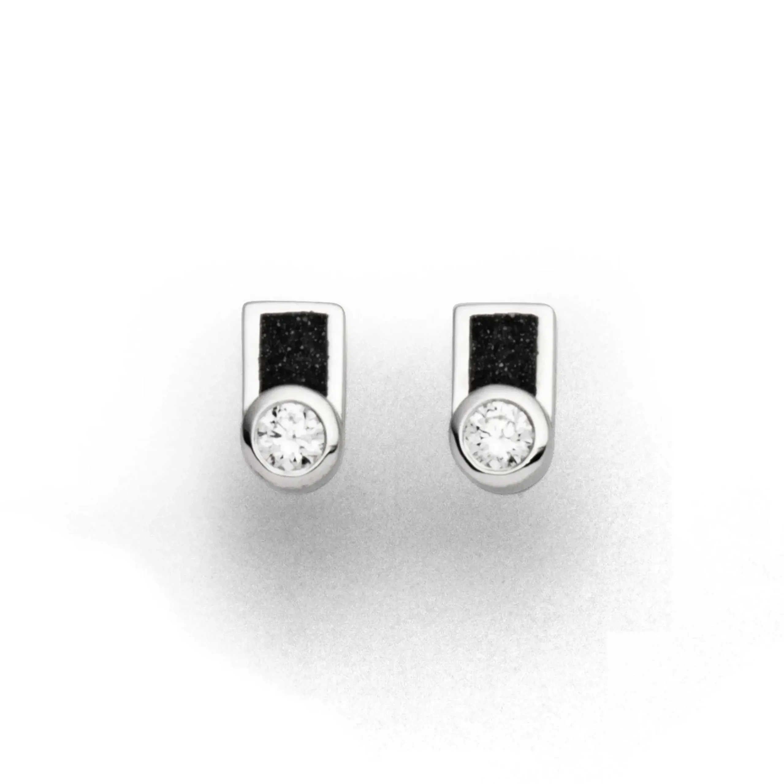Zierlicher, eckiger Ohrring „Venus“, gefüllt mit Lavasand, der durch die Kombination mit einem kleinen Zirkoniastein am unteren Rand wie der hellste Planet am Himmel, die „Venus“ erstrahlt. Alles gefasst in rhodiniertem 925er Sterlingsilber. Durch die Rhodinierung ist das Schmuckstück anlaufgeschützt.