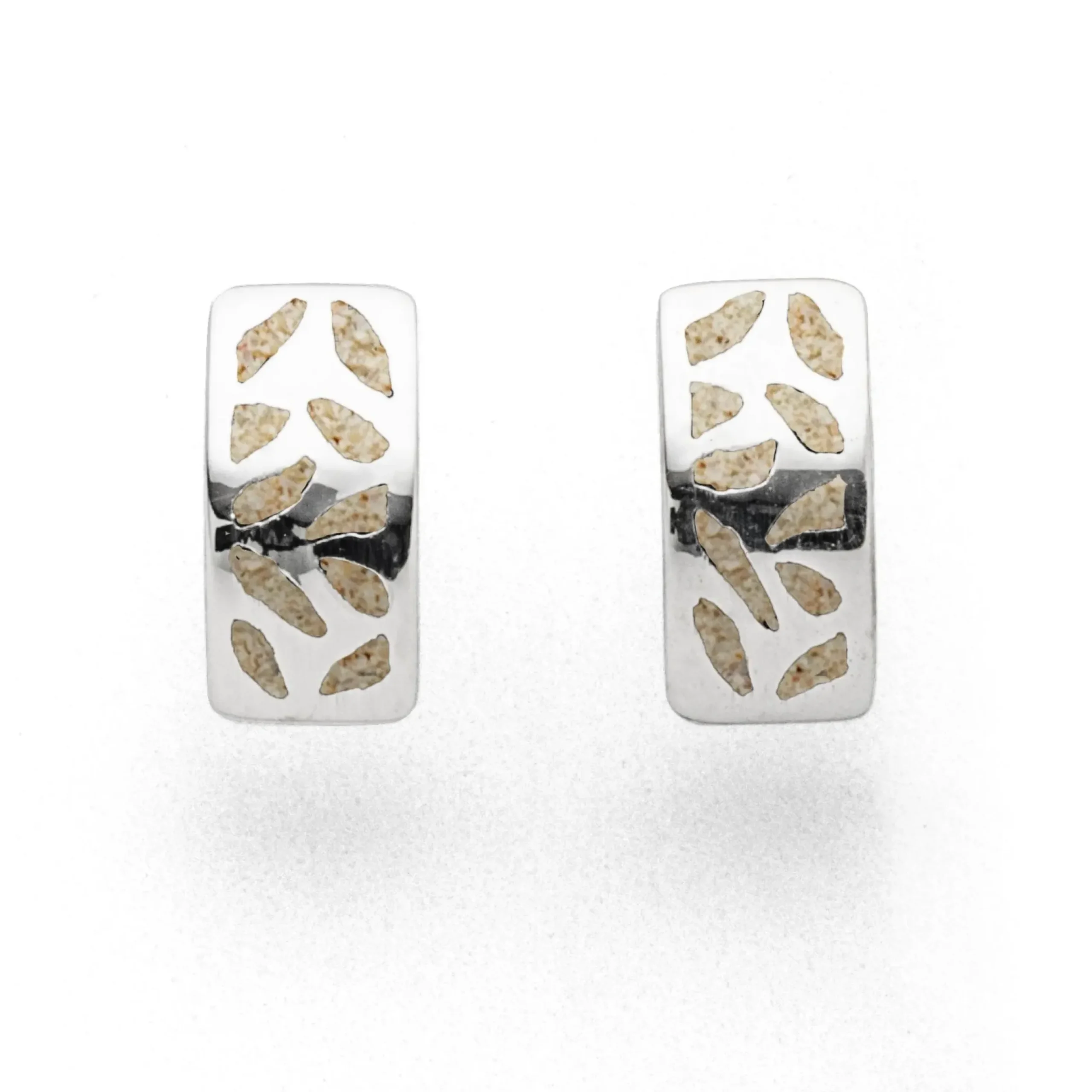 „Wandel“ länglich, eckiger, handgefertigter Ohrstecker, besetzt mit verspielten, geschwungenen Strandsand gefüllten Flächen, aus rhodiniertem 925er Sterlingsilber.
