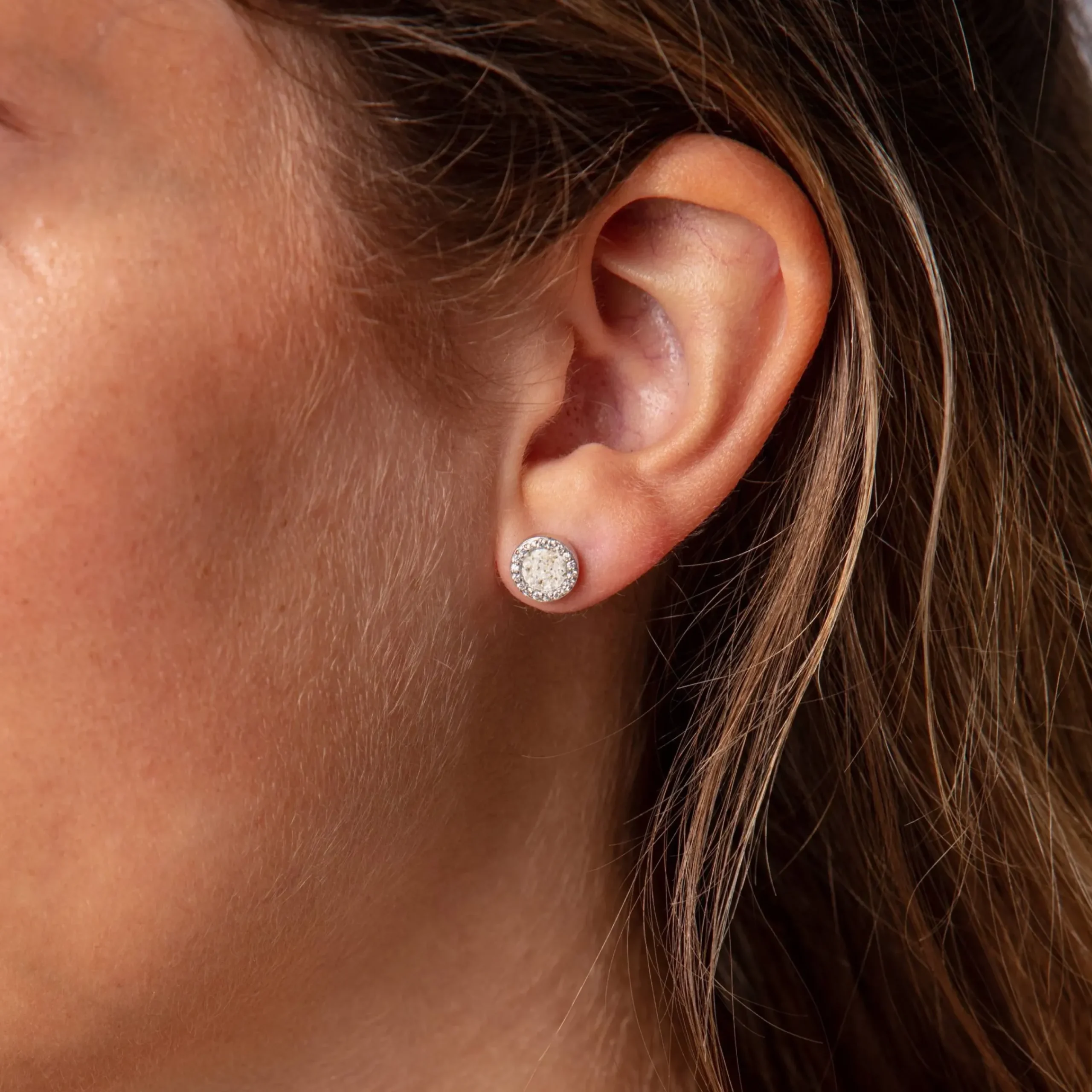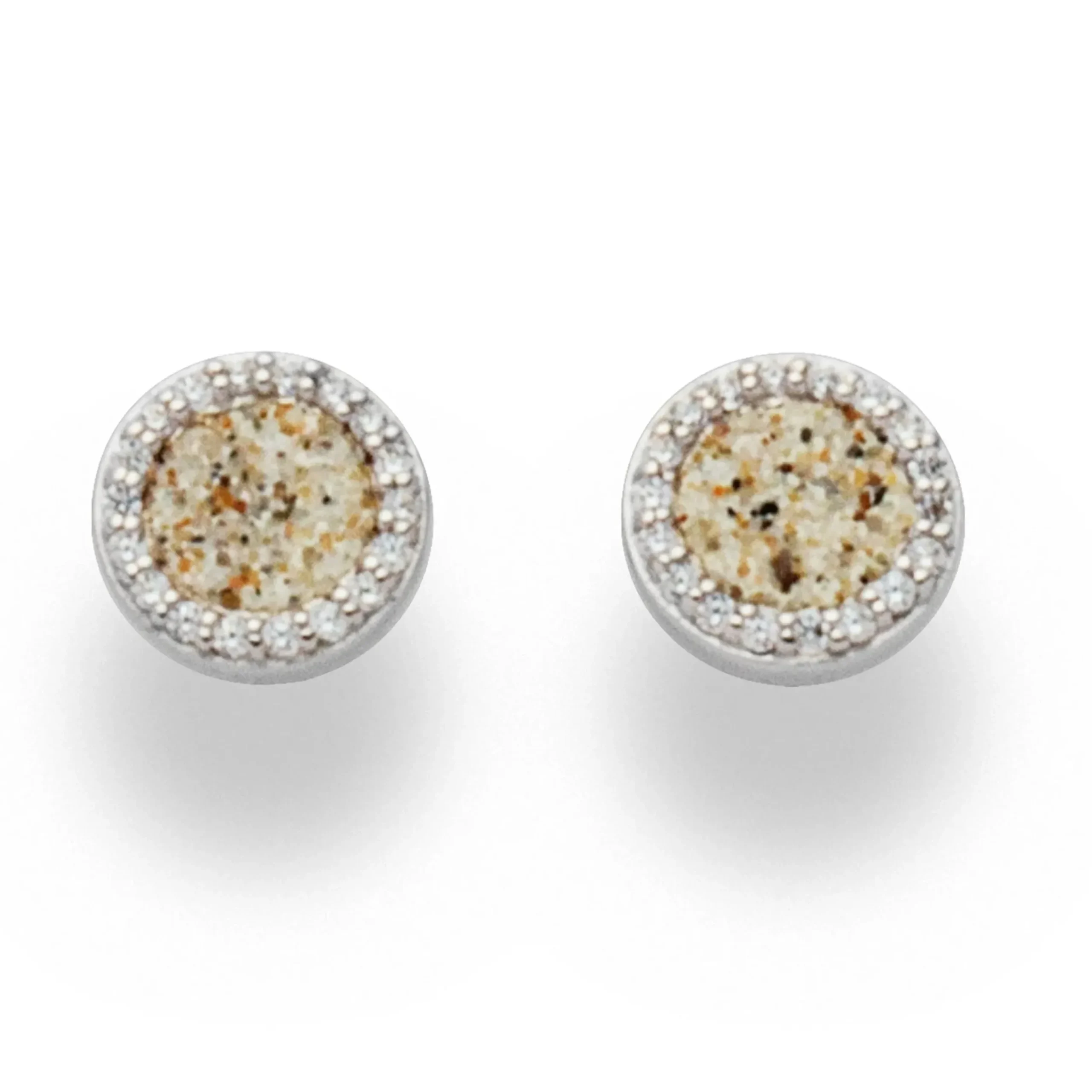Runder Ohrring „Wasserflimmern“, gefüllt mit Strandsand und umrahmt von 36 kleinen Zirkoniasteinen, die an das „Wasserflimmern“ am Strand erinnern. Gefasst in rhodiniertem 925er Sterling-Silber. Durch die Rhodinierung ist das Schmuckstück anlaufgeschützt.