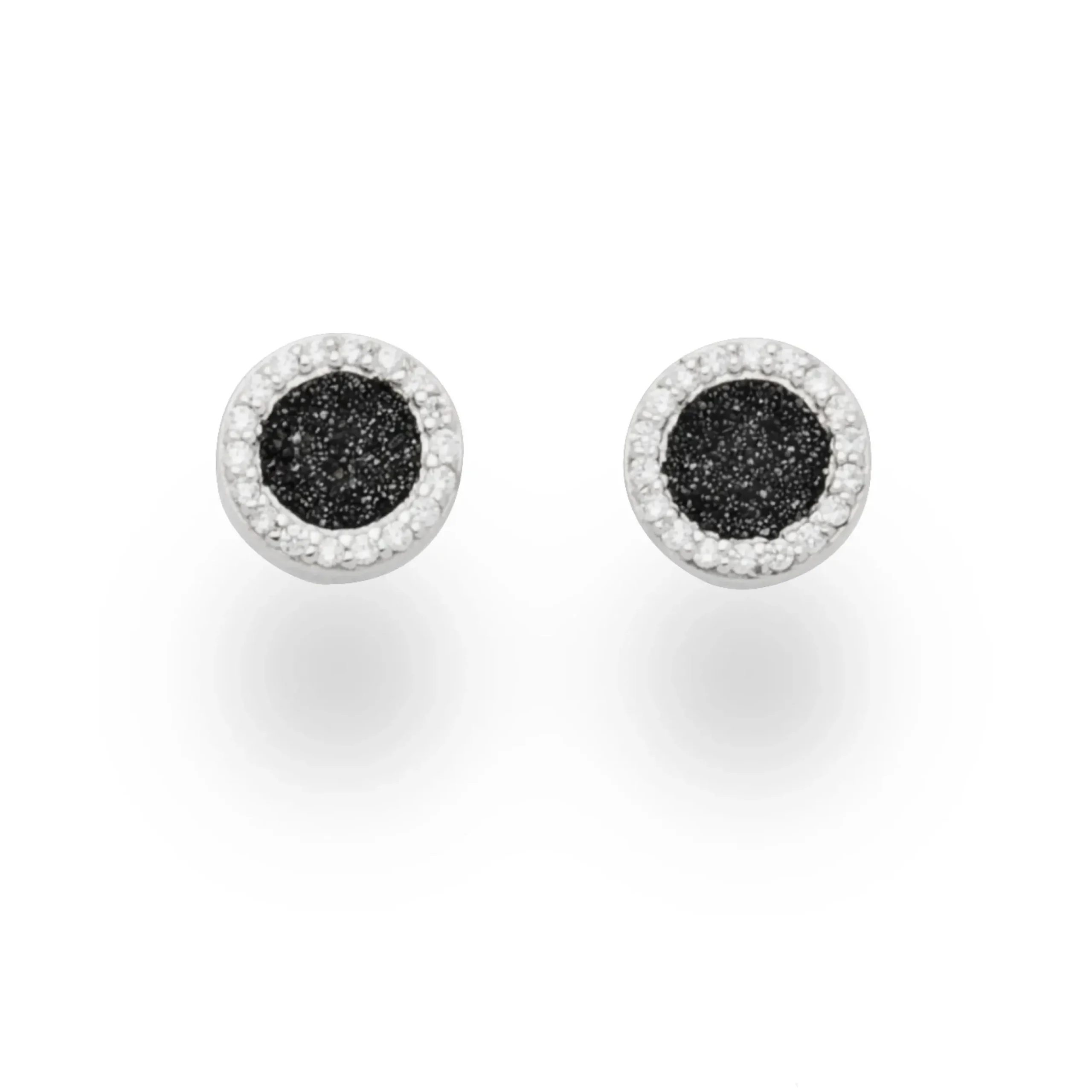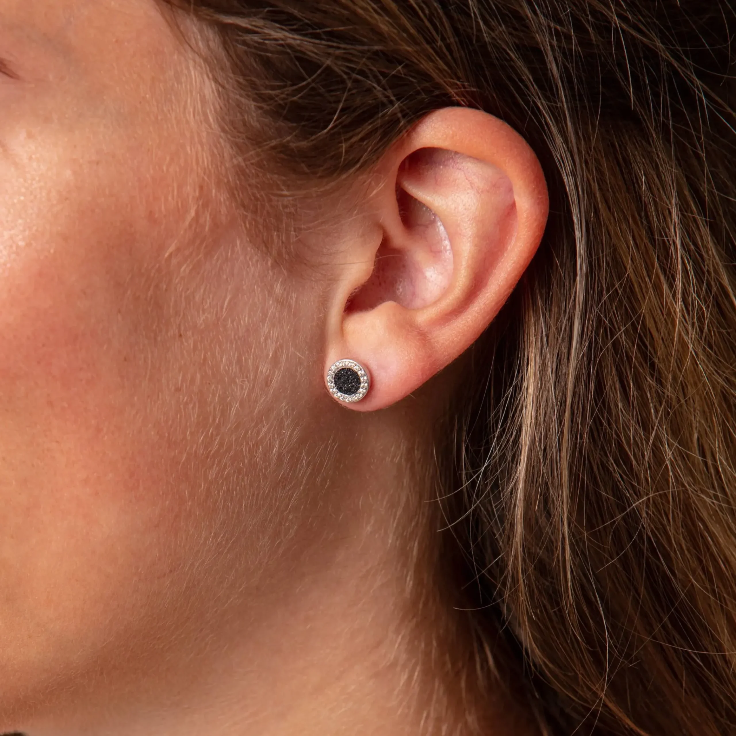 Runder Ohrring „Wasserflimmern“, gefüllt mit Lavasand und umrahmt von 36 kleinen Zirkoniasteinen, die an das „Wasserflimmern“ am Strand erinnern. Gefasst in rhodiniertem 925er Sterlingsilber. Durch die Rhodinierung ist das Schmuckstück anlaufgeschützt.