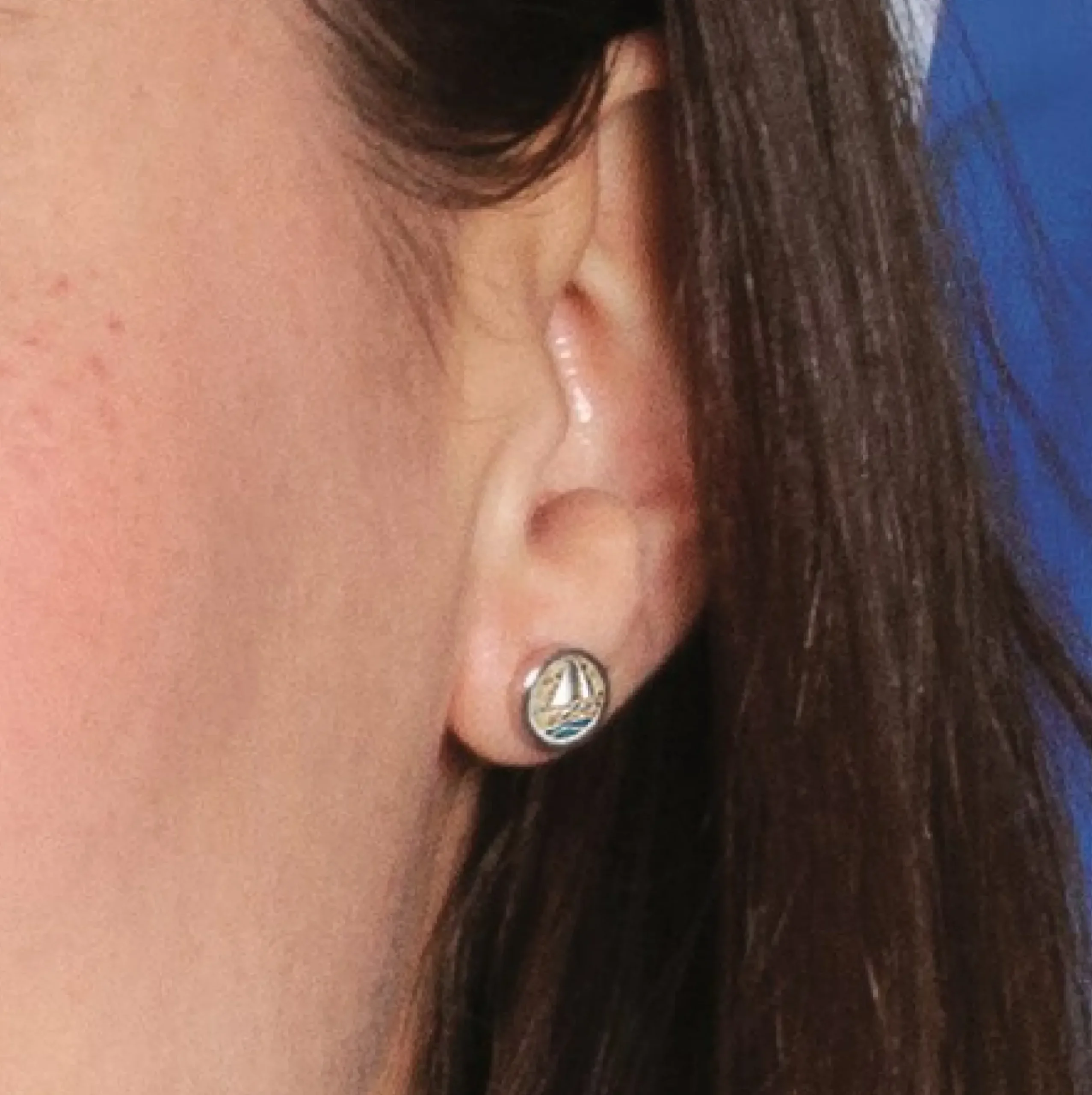 Ohrstecker „Ahoi“, kleiner runder Ohrstecker mit einem Plattbodenschiff und Wellen, in Strandsand und blauen Steinsand eingebettet und gefaßt in rhodiniertem 925er Silber