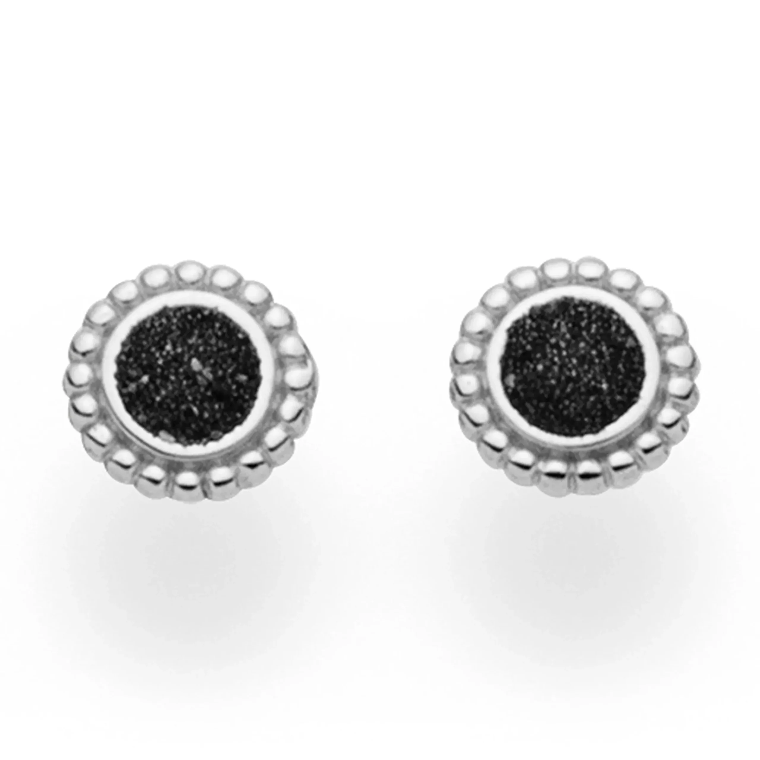 Runder Ohrstecker „Jupiter“ mit kleinen Silberkügelchen am Rand und gefüllt mit Lavasand, gefasst in rhodiniertem 925er Sterling-Silber