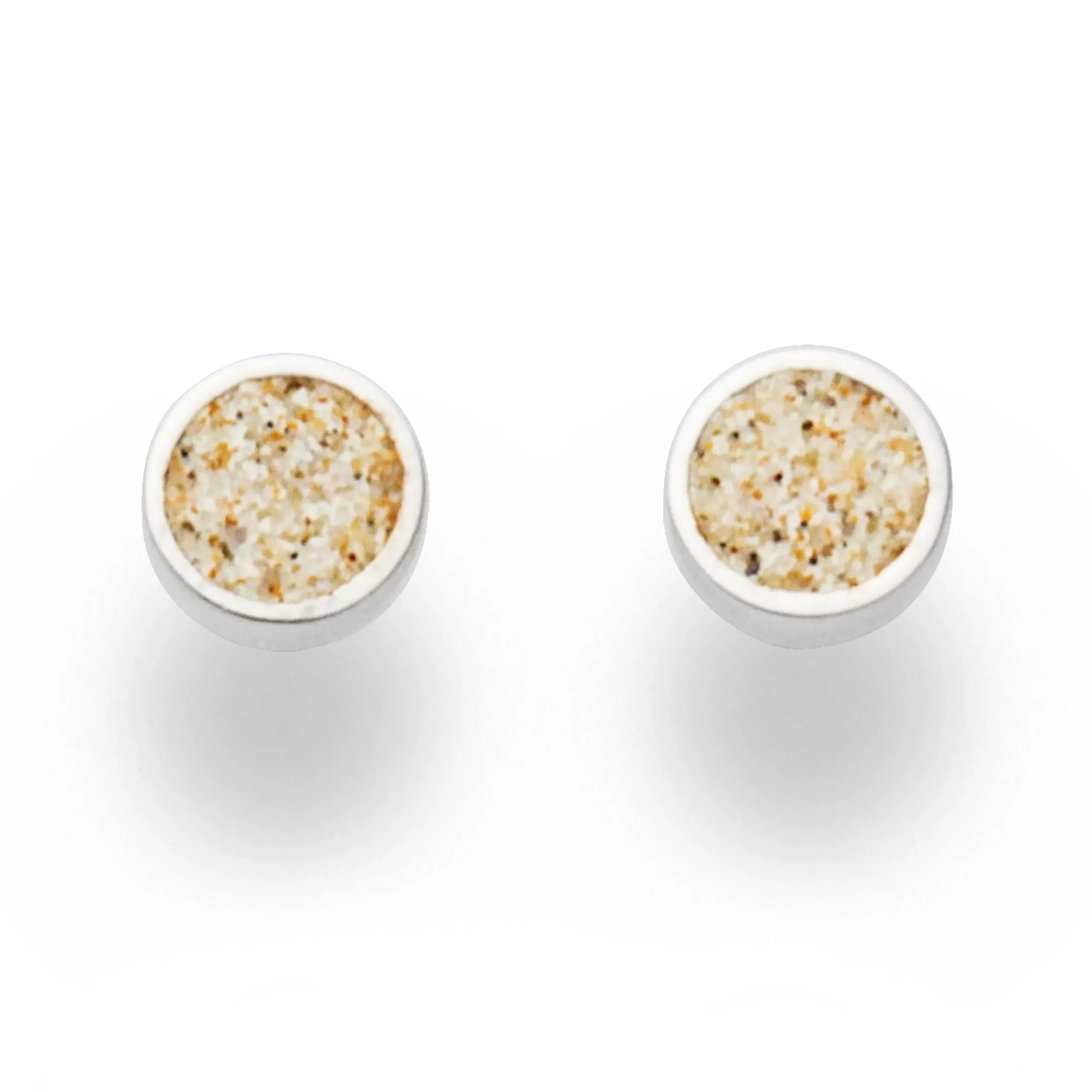 Kleiner, runder flacher Ohrstecker 8 mm „kleiner Sandkuss“: mit Strandsand gefüllt und gefaßt in rhodiniertem 925er Sterlingsilber. Durch die Rhodinierung ist das Schmuckstück anlaufgeschützt.