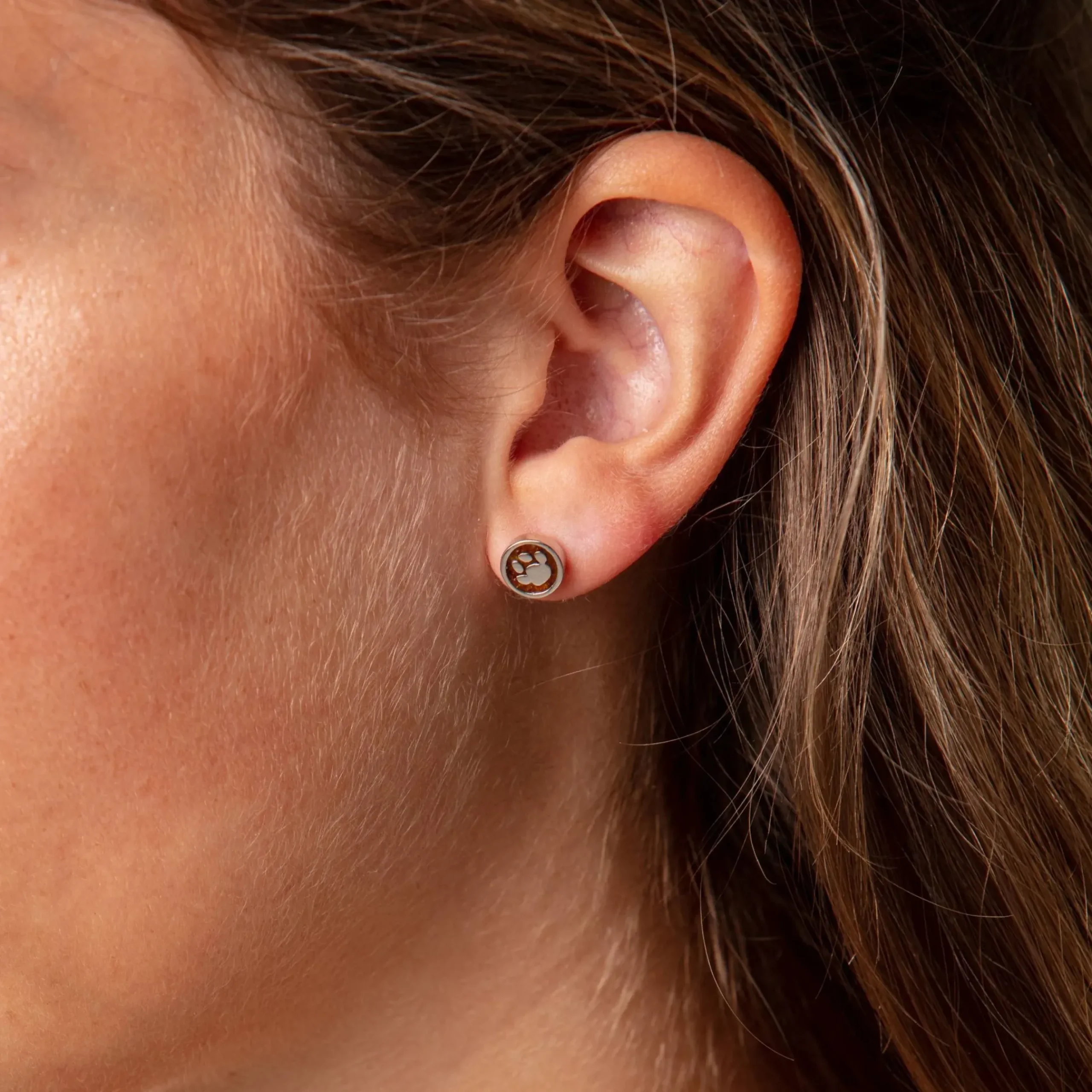 Runder Ohrstecker „Lucky Dog“ gefüllt mit bernsteinsand und einer Hundepfote aus Silber, gefasst in rhodiniertem 925er Silber