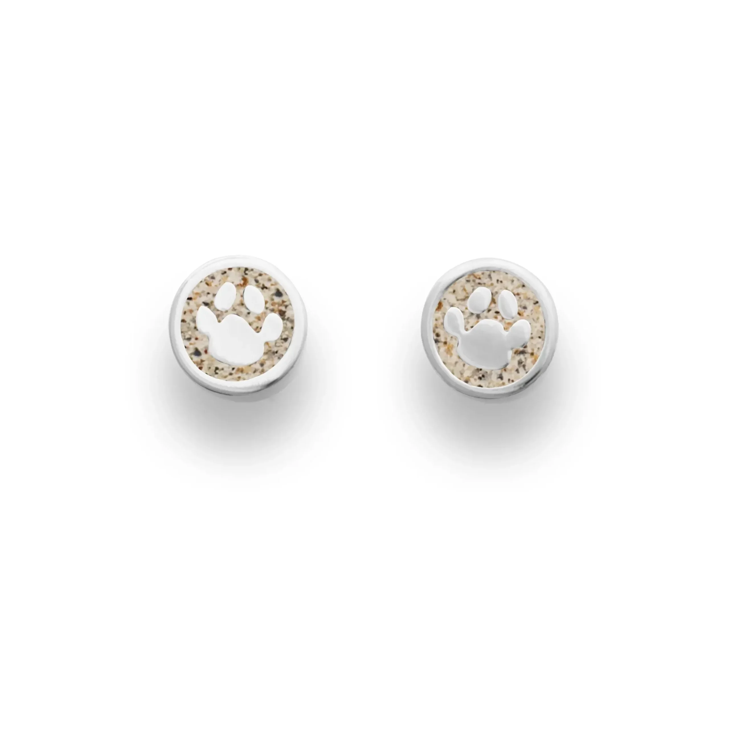 Runder Ohrstecker „Lucky Dog“ gefüllt mit Strandsand und einer Hundepfote aus Silber, gefasst in rhodiniertem 925er Silber
