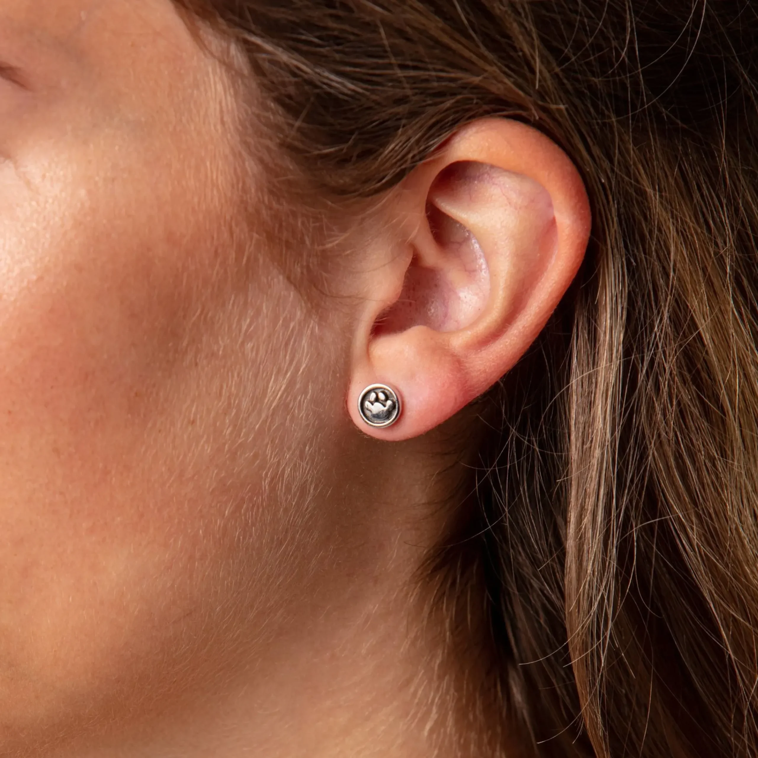 Runder Ohrstecker „Lucky Dog“, innen dunkel rhodiniert,mit einer Hundepfote aus hell rhodiniertem Silber, alles aus 925er Sterling-Silber