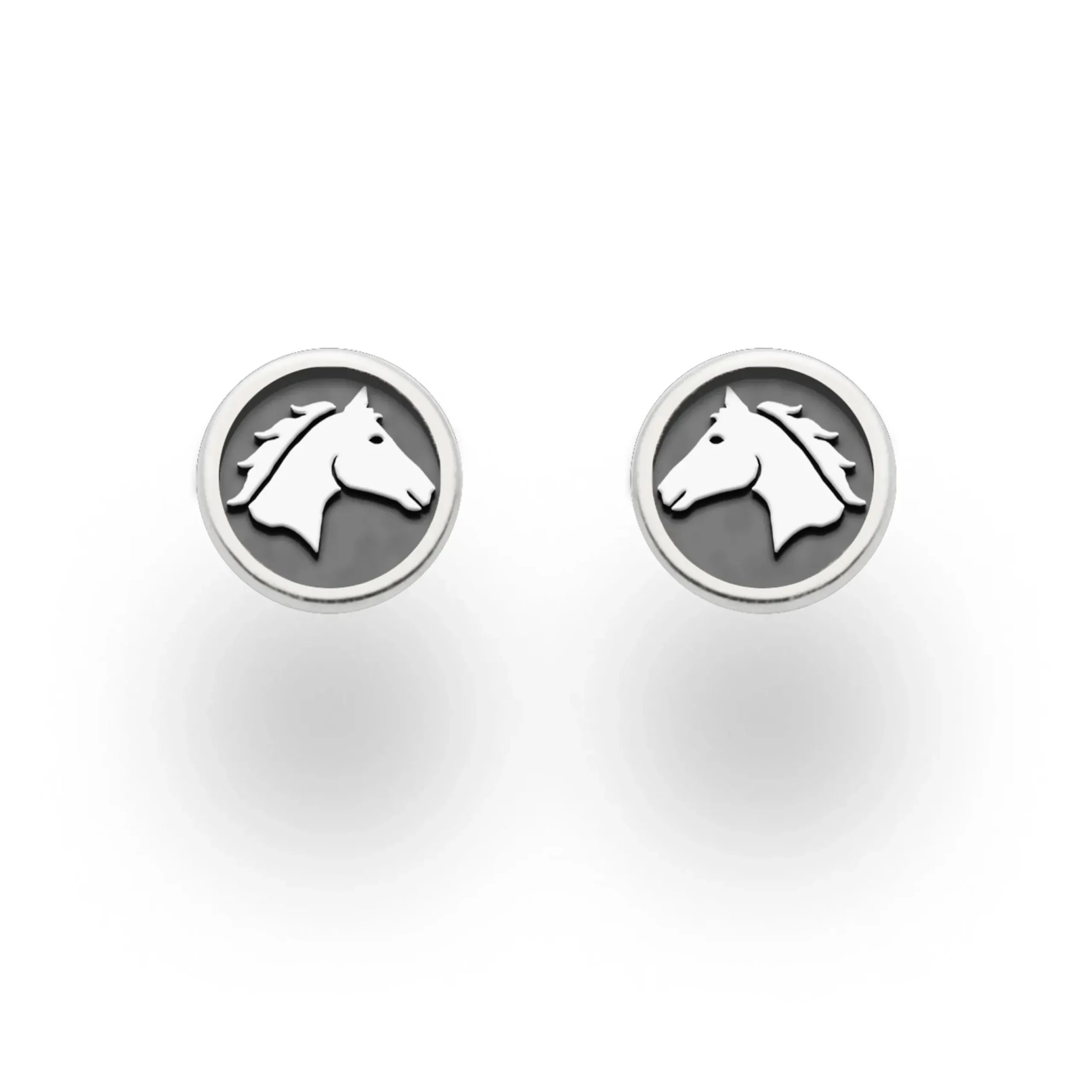 Runder Ohrstecker „Pferdeglück“ mit einem Pferdekopf aus Silber, innen dunkel rhodiniert und gefasst in rhodiniertem 925er Silber
