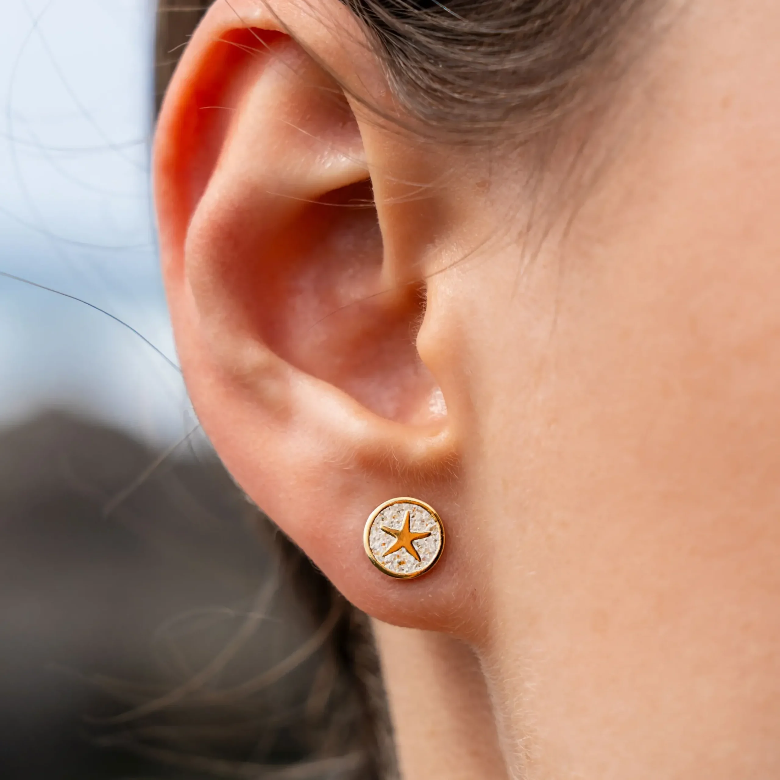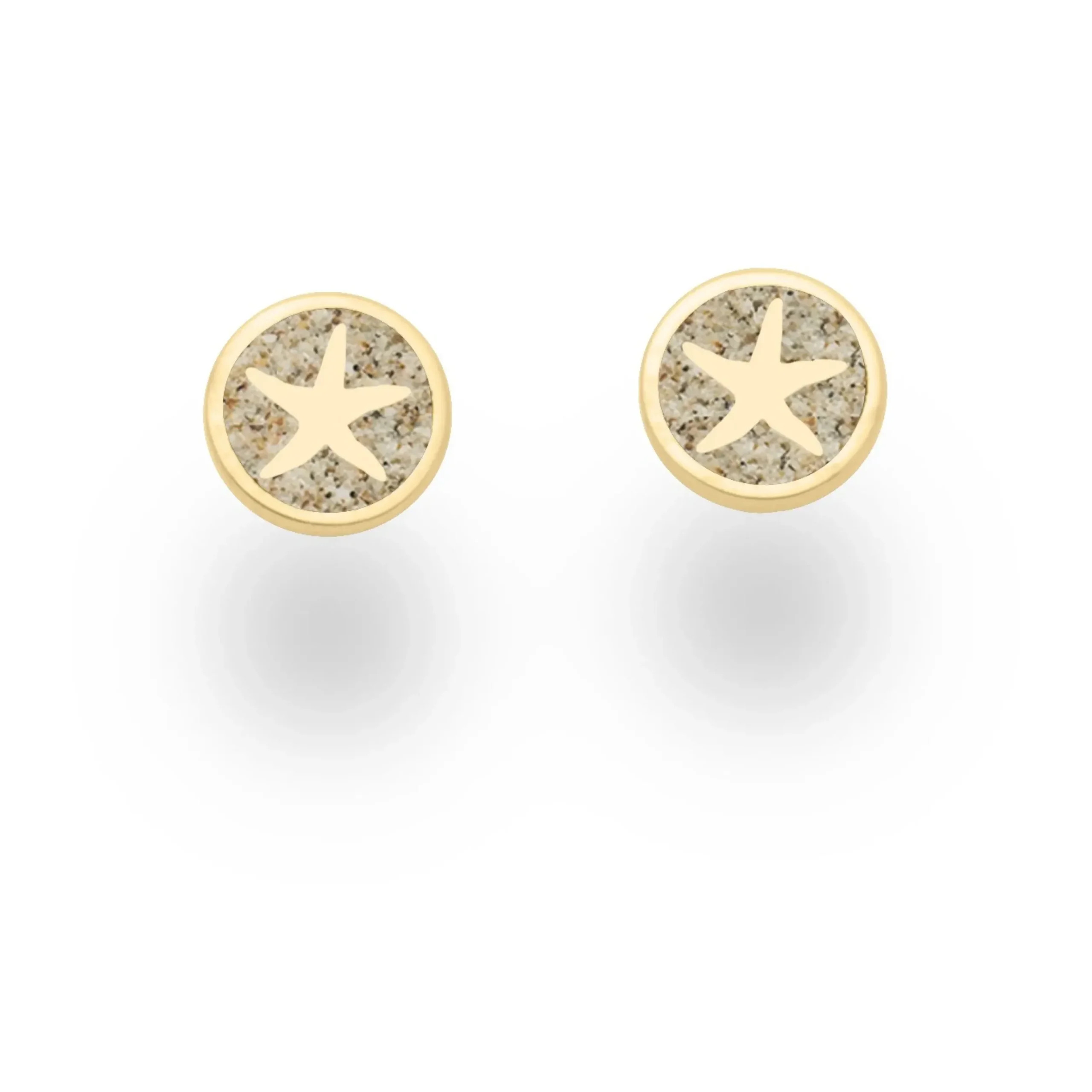 Ohrstecker „Seestern“, kleiner runder Ohrstecker mit einem in Strandsand eingebetteten Stern, gefaßt in vergoldetem 925er Sterlingsilber.