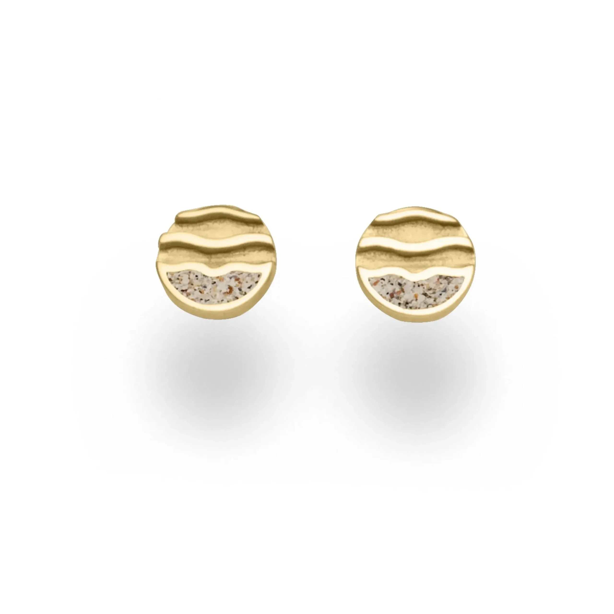 Kleiner, runder Ohrstecker „Strandwellen“, im unteren Drittel mit Strandsand gefüllt. Aus vergoldetem 925er Sterling-Silber gefertigt.