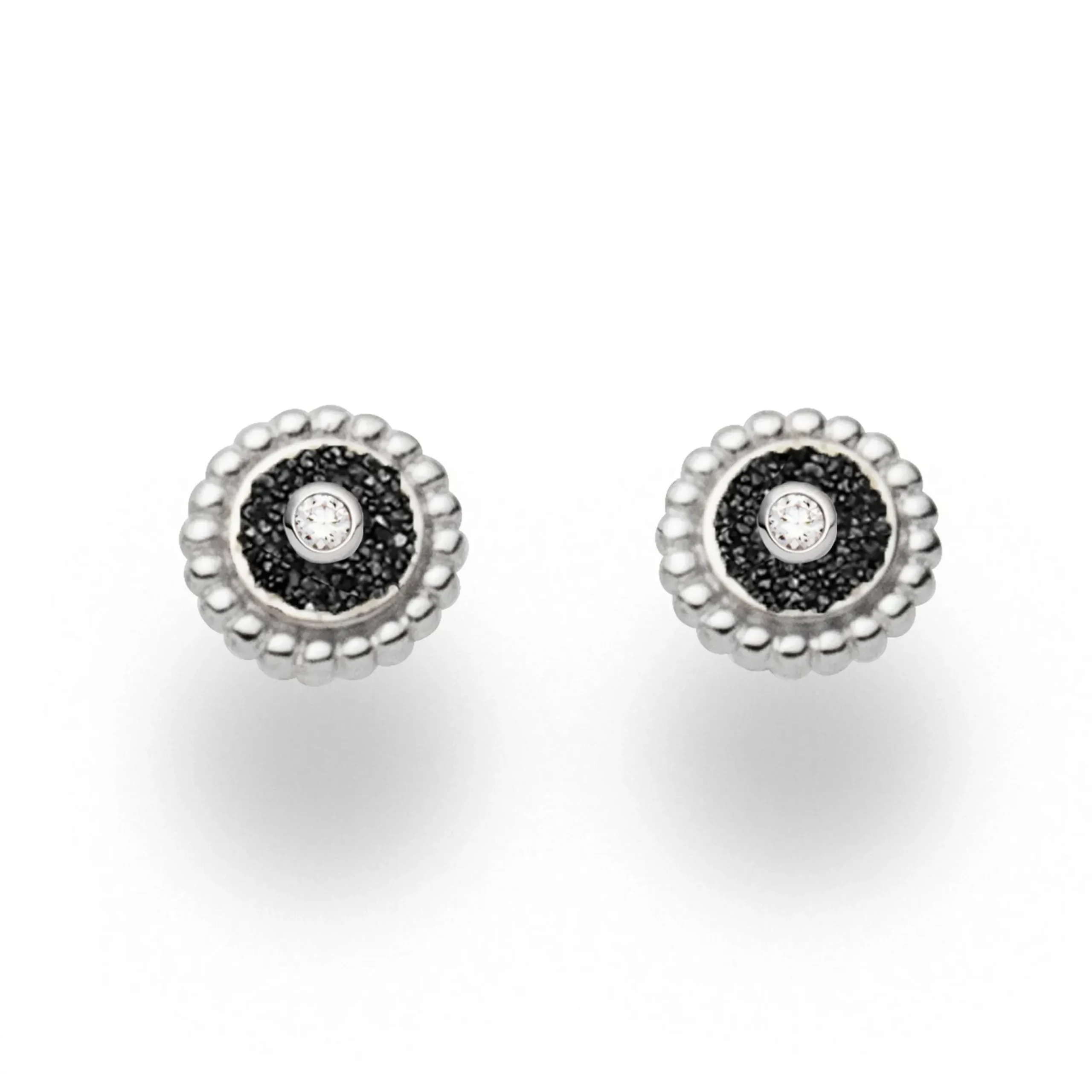Kleiner, runder Ohrstecker „Strandzauber 2.0“, gefüllt mit Lavasand und einem Zirkonia in der Mitte, umrahmt von kleinen Silberkügelchen. Gefasst in rhodiniertem 925er Sterling-Silber. Durch die Rhodinierung ist das Schmuckstück anlaufgeschützt.