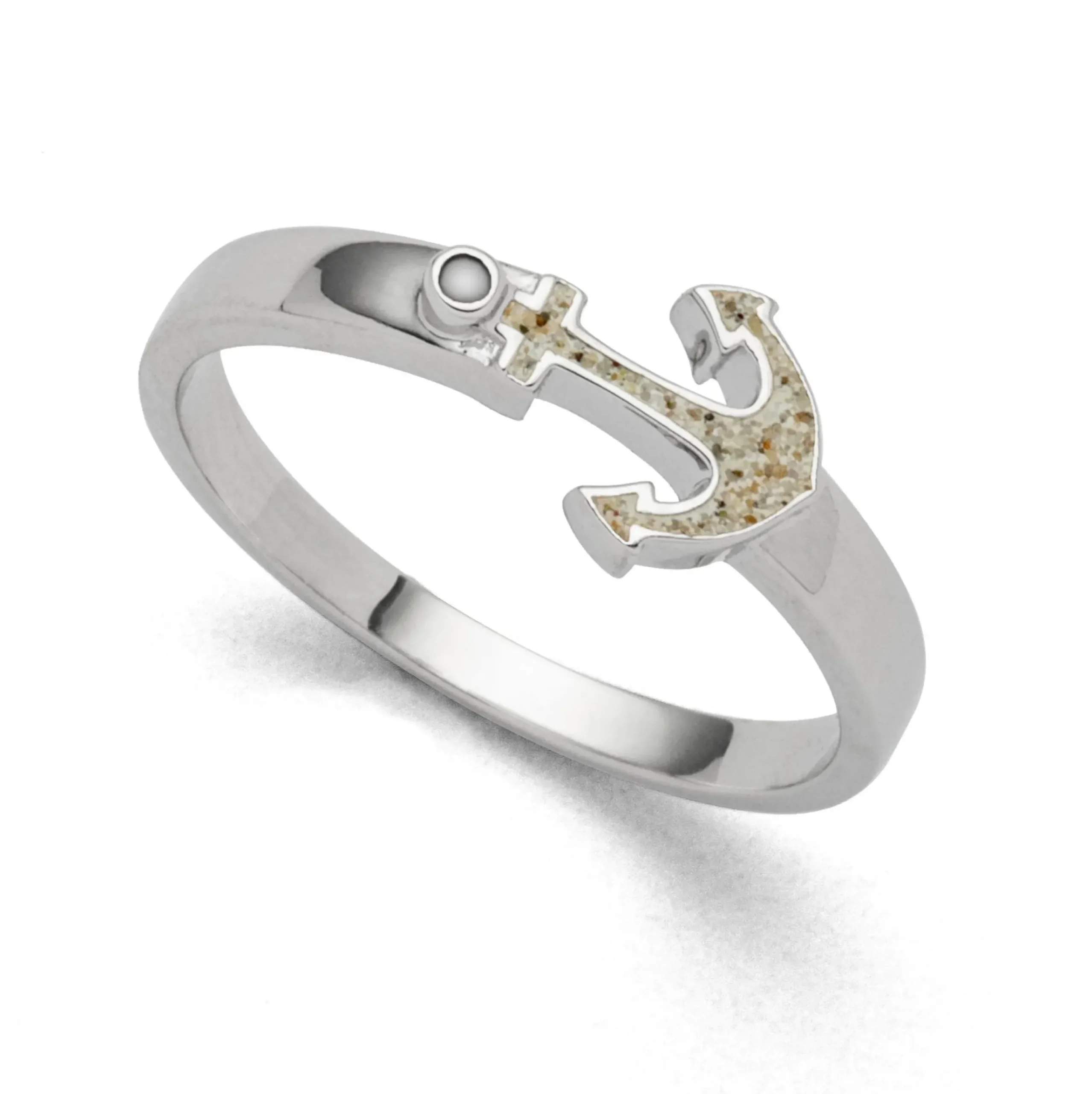 Ring „Anker 2.0“ mit einem Anker als Motiv, eingebettet in Strandsand und gefasst in rhodiniertem 925er Sterlingsilber.
