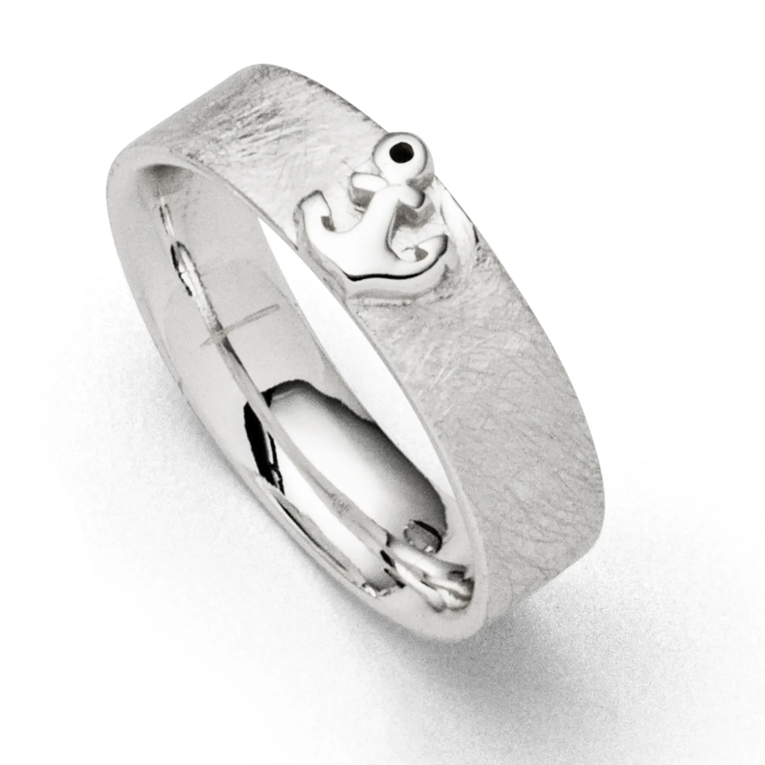 Ring „Anker“, schmaler gebürsteter Bandring mit einem polierten Anker, alles aus anlaufgeschütztem 925er Sterlingsilber.