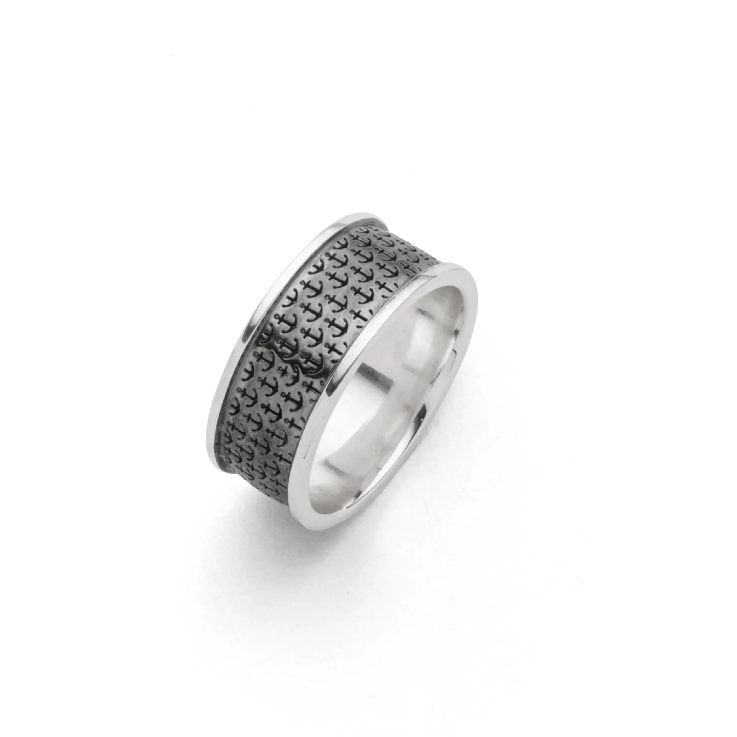 Bandring „Ankerplatz“, 9 mm mit kleinen gelaserten, oxidierten Anker-Icons, alles aus 925er Sterling-Silber.