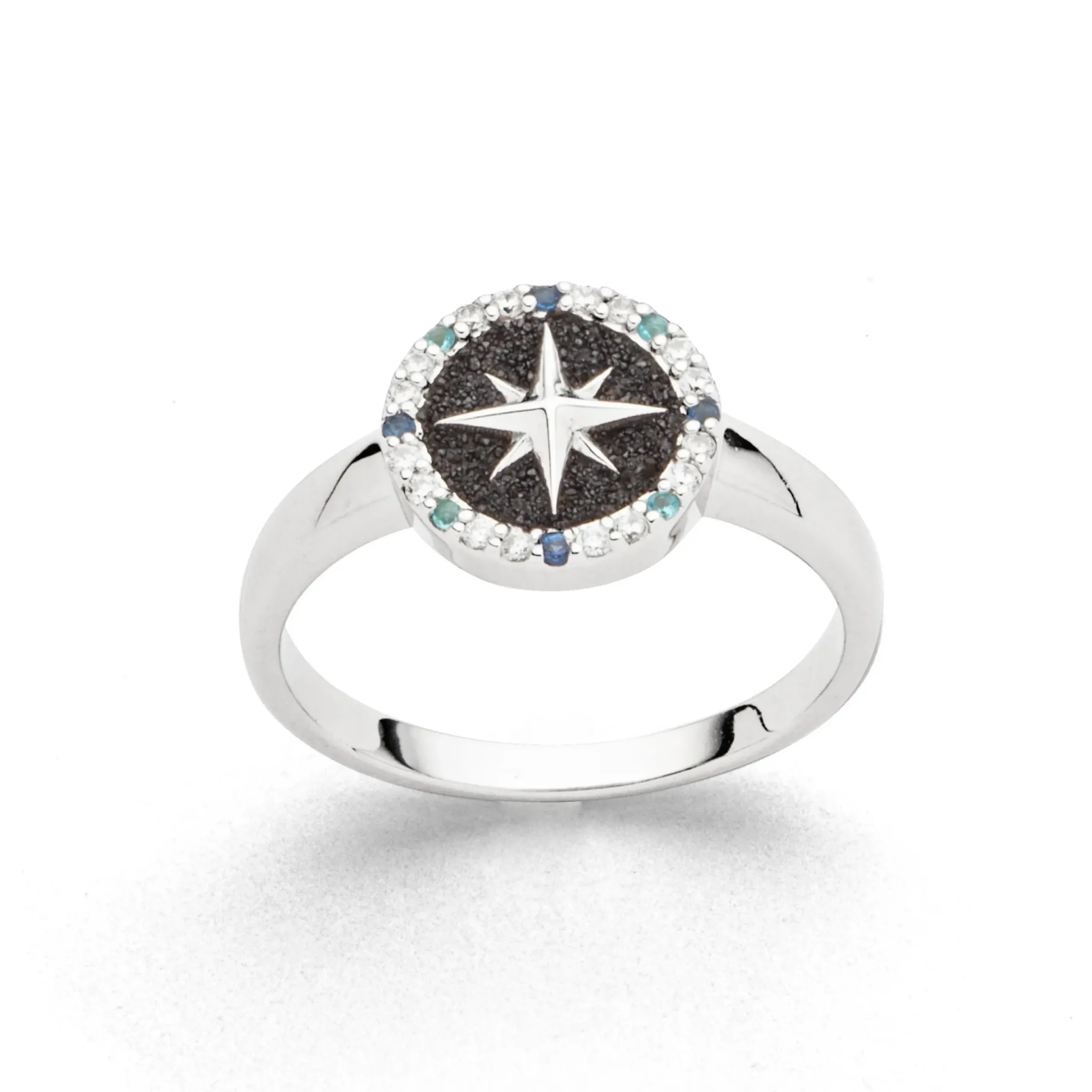 Runder Ring „Kompassrose 2.0“ der äußere Rand ist mit Zirkoniasteinen in den Farben, weiß, hellblau und dunkelblau besetzt, innen mit Lavasand gefüllt, aus poliertem, rhodiniertem 925er Sterling-Silber