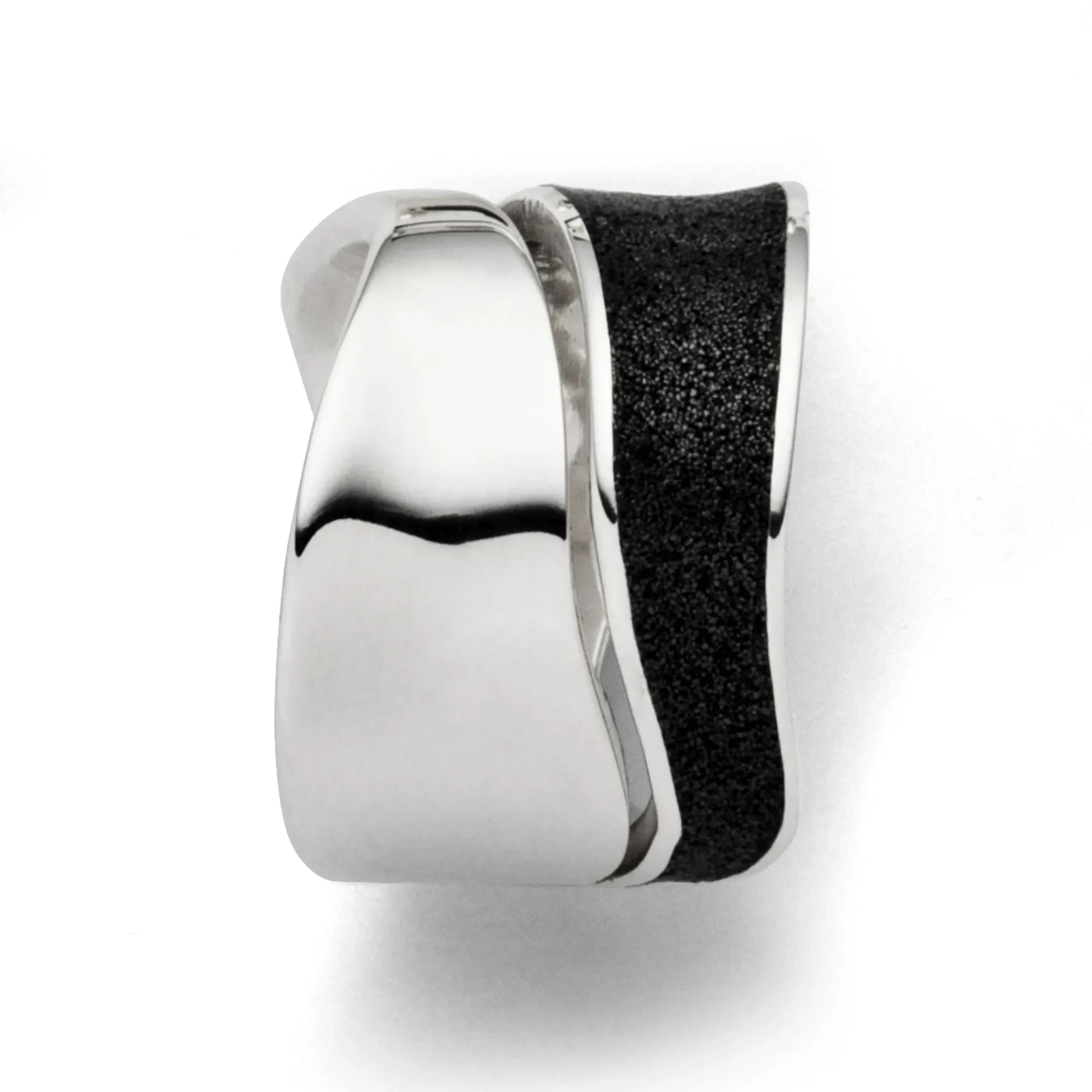 Breiter, geschwungener Ring mit Lavasand aus poliertem, rhodiniertem 925er Sterling-Silber